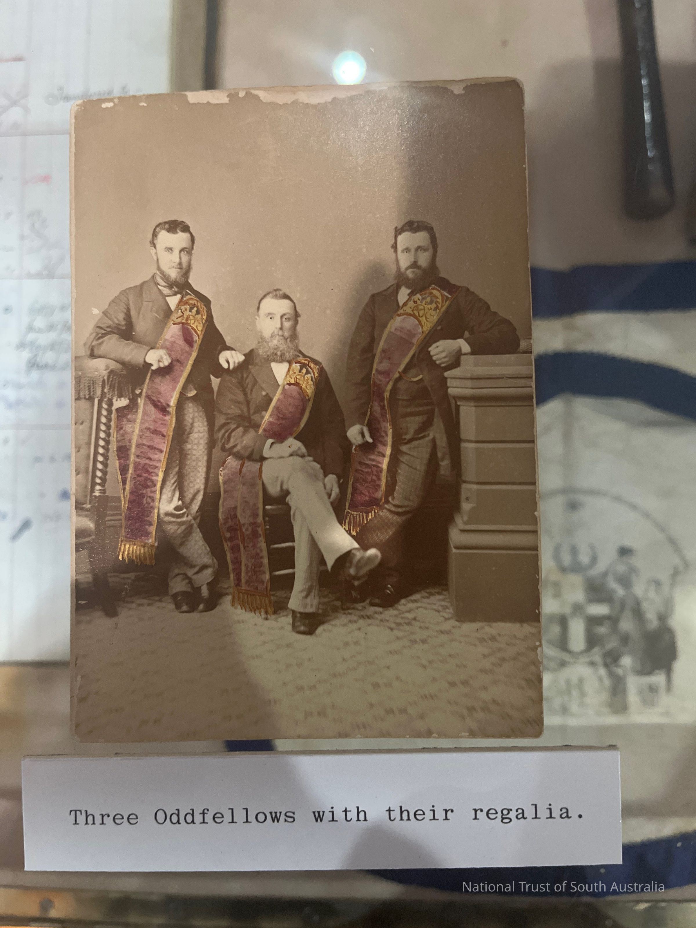 Three Oddfellows with their regalia. Taken by T Duryea, Ryan Street Moonta