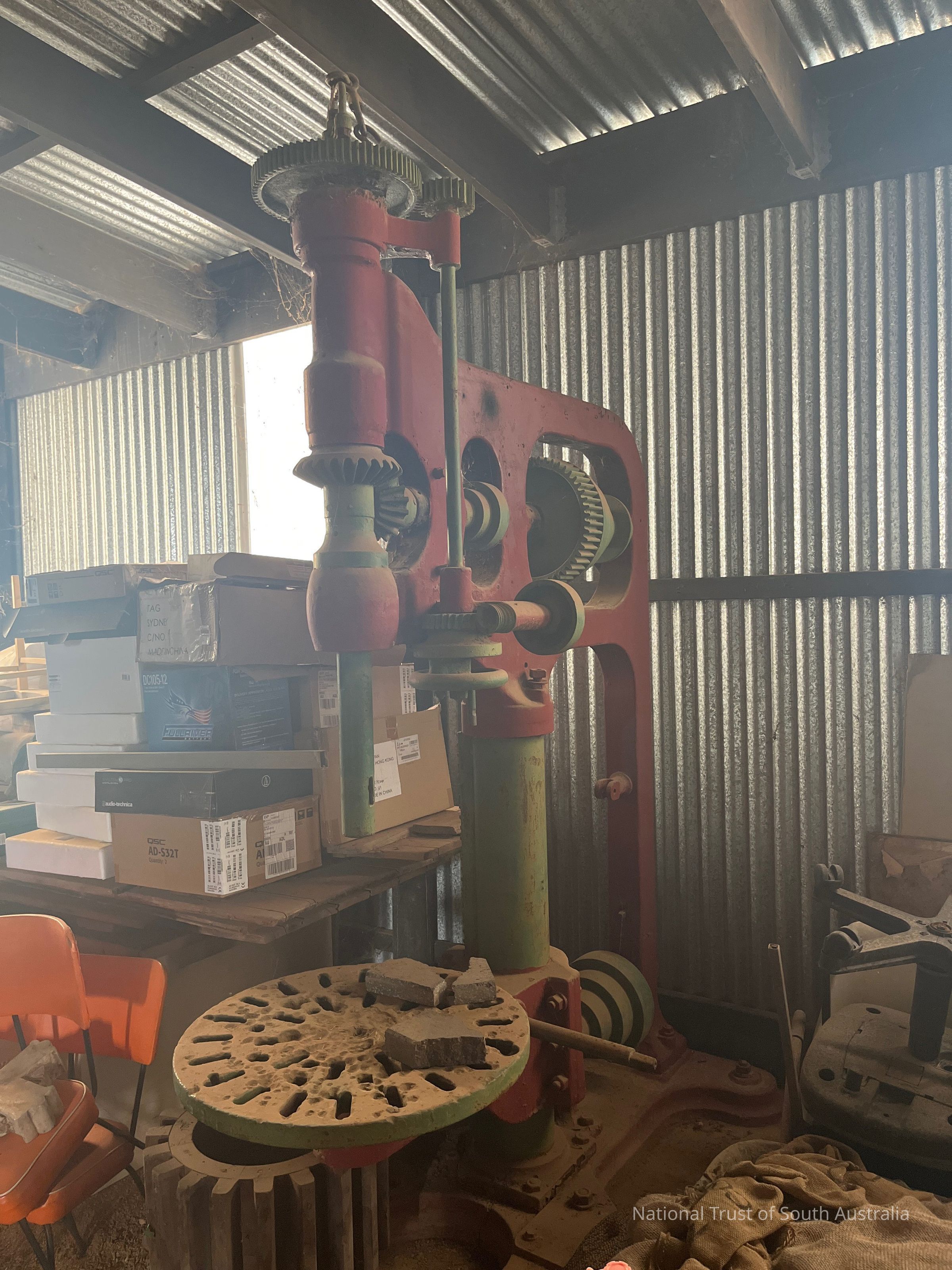 Large green and red machine, with space for a drill bit. No visible manufacturers mark. Could also be called power hammer