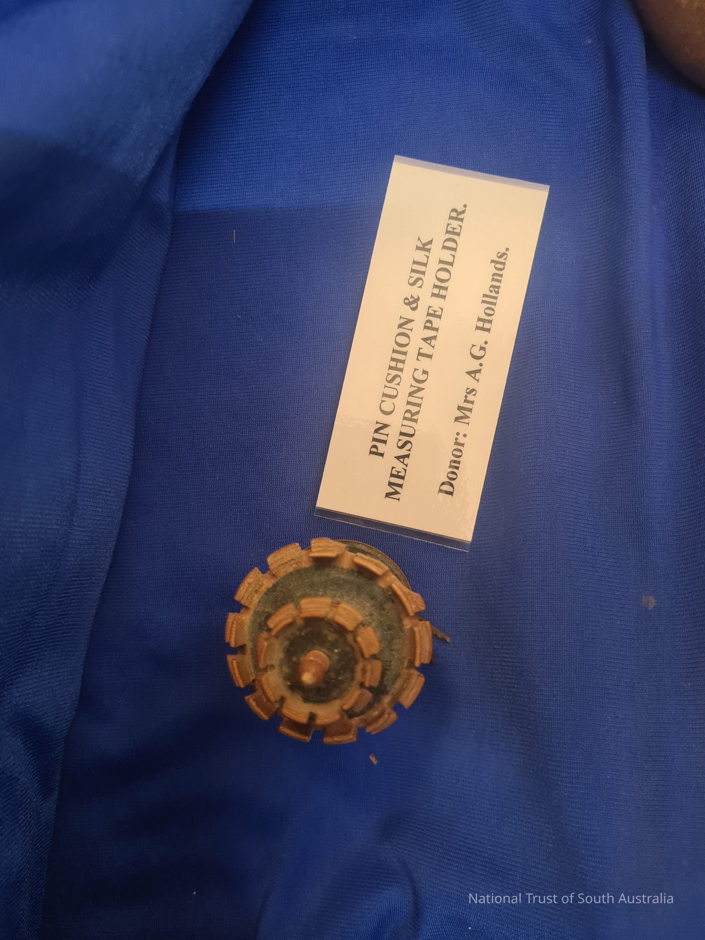 Pin Cushion and silk measuring tape holder. Donated by A. G. Hollands