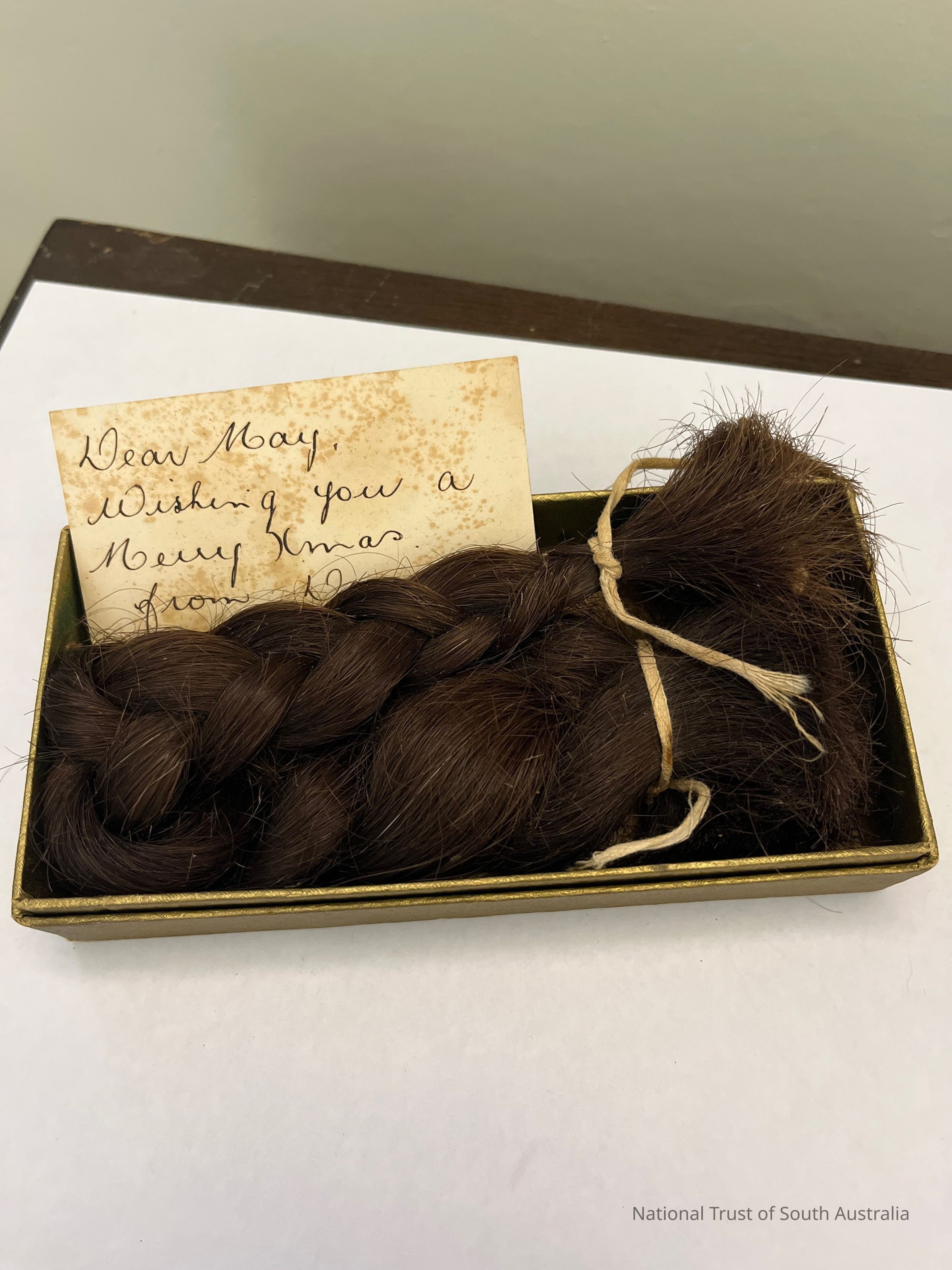 Boxed plait. Accompanying note reads: Dear May, Wishing you a Merry Xmas. From Dorrie x