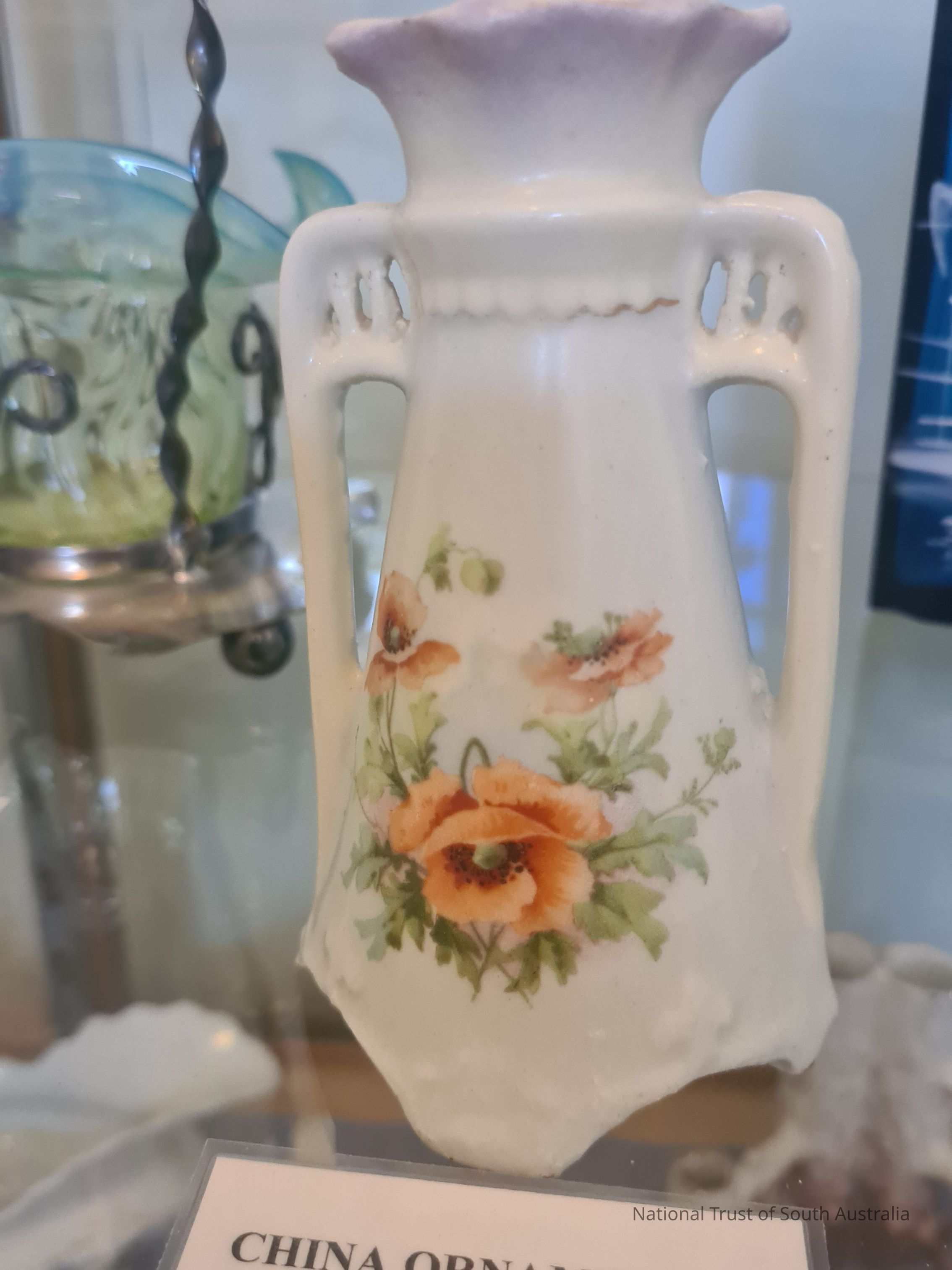White Ppppy Vase. Painted orange poppies. Made oschina. Donated by Miss Callery