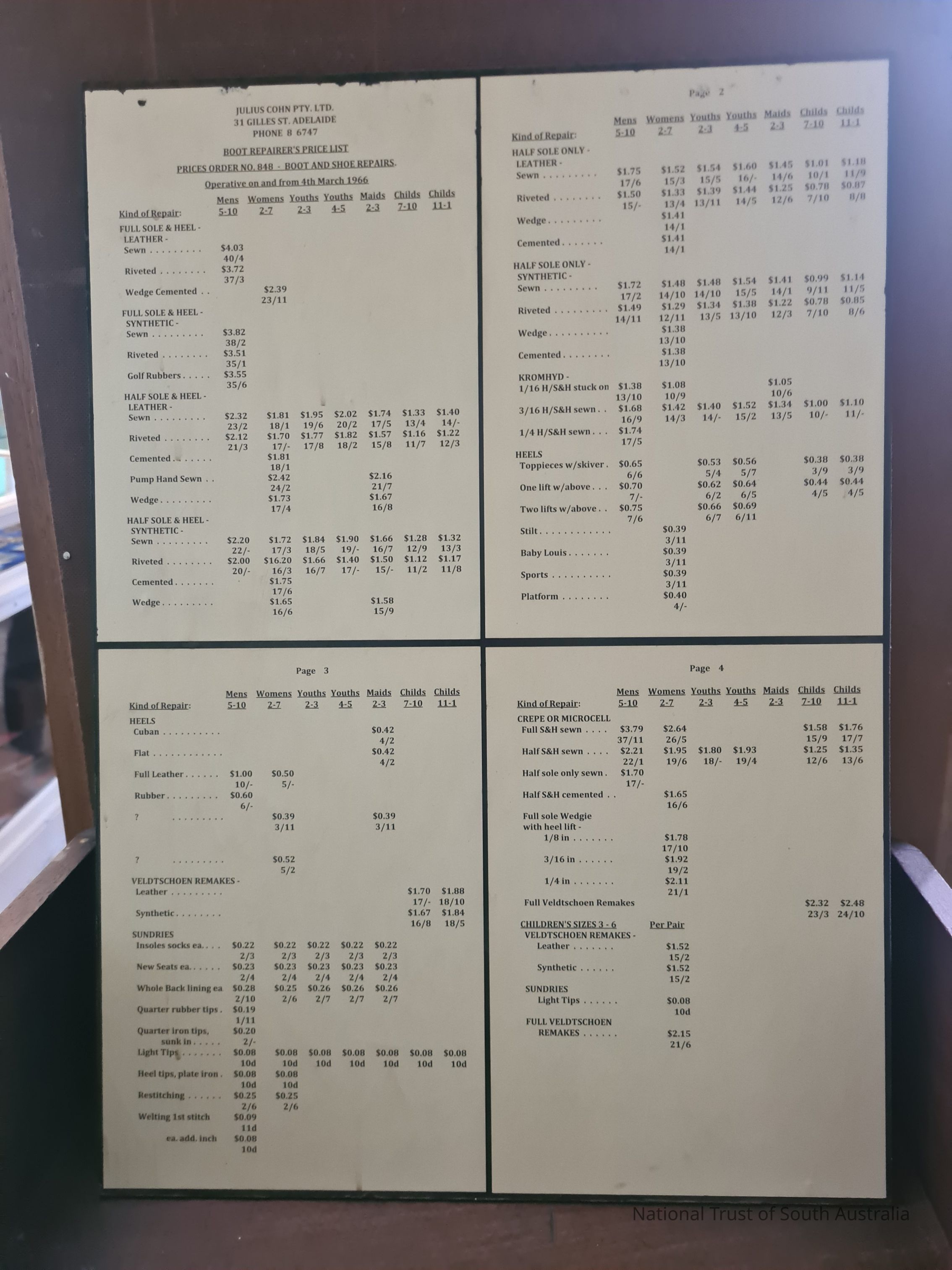 Printed copy of price board Julius Cohn & Co. Adelaide