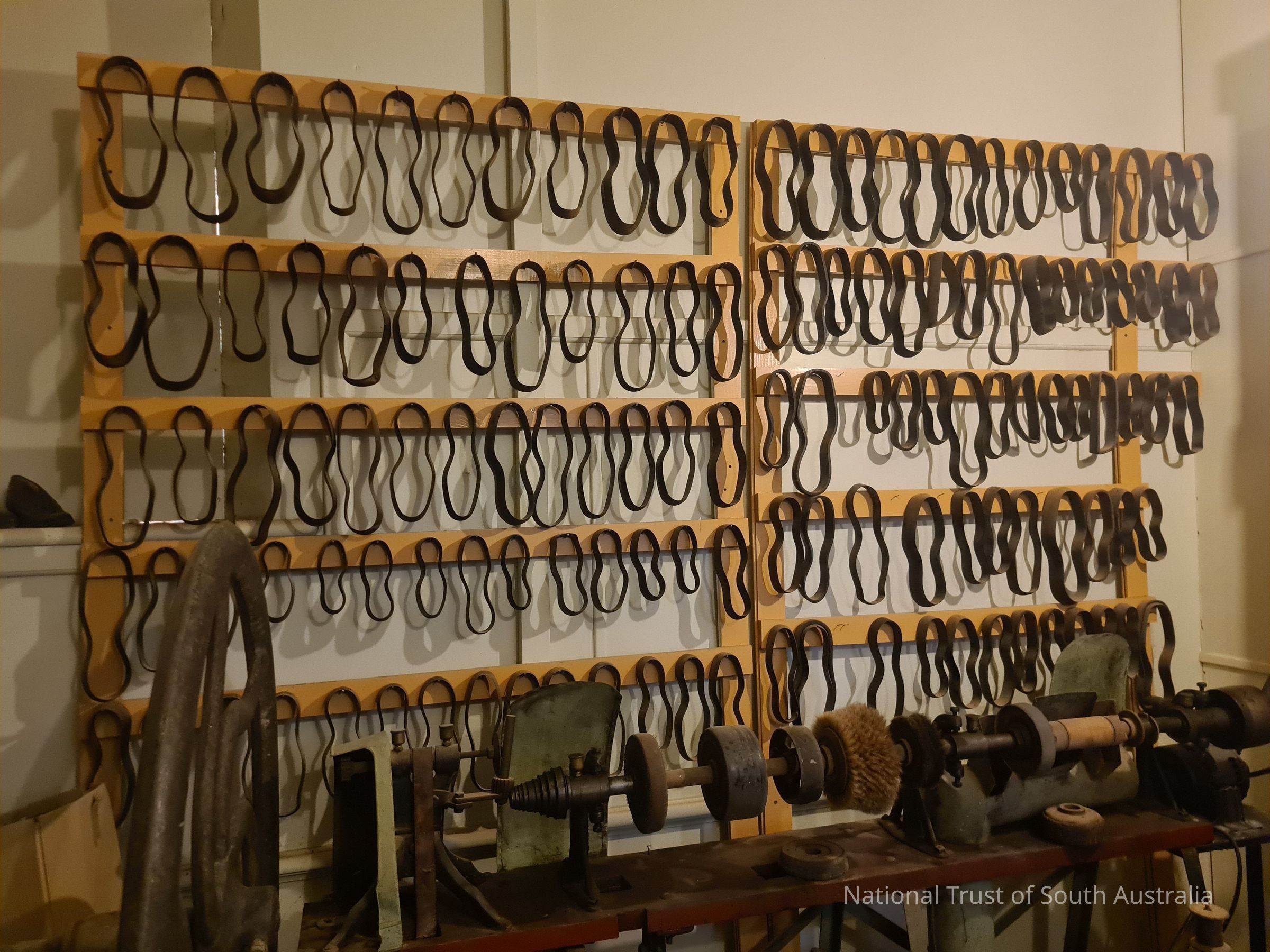 Racks of various sized cast iron shoe forms.