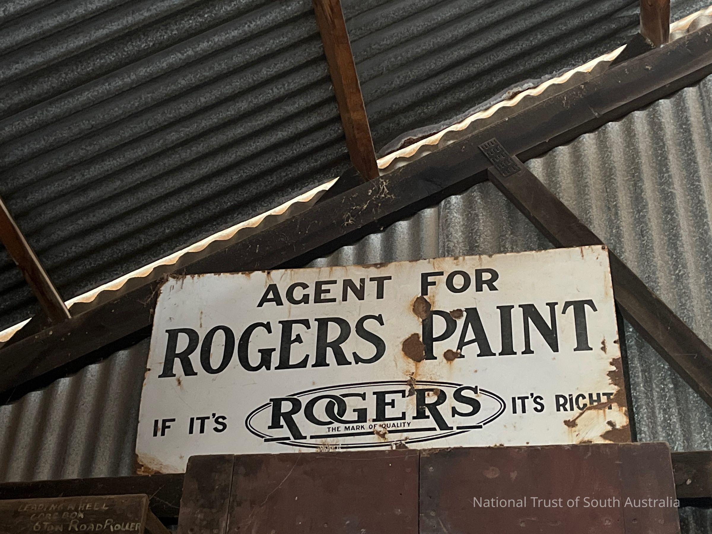 Metal sign. Text: AGENT FOR ROGERS PAINT IF ITS ROGERS ITS RIGHT