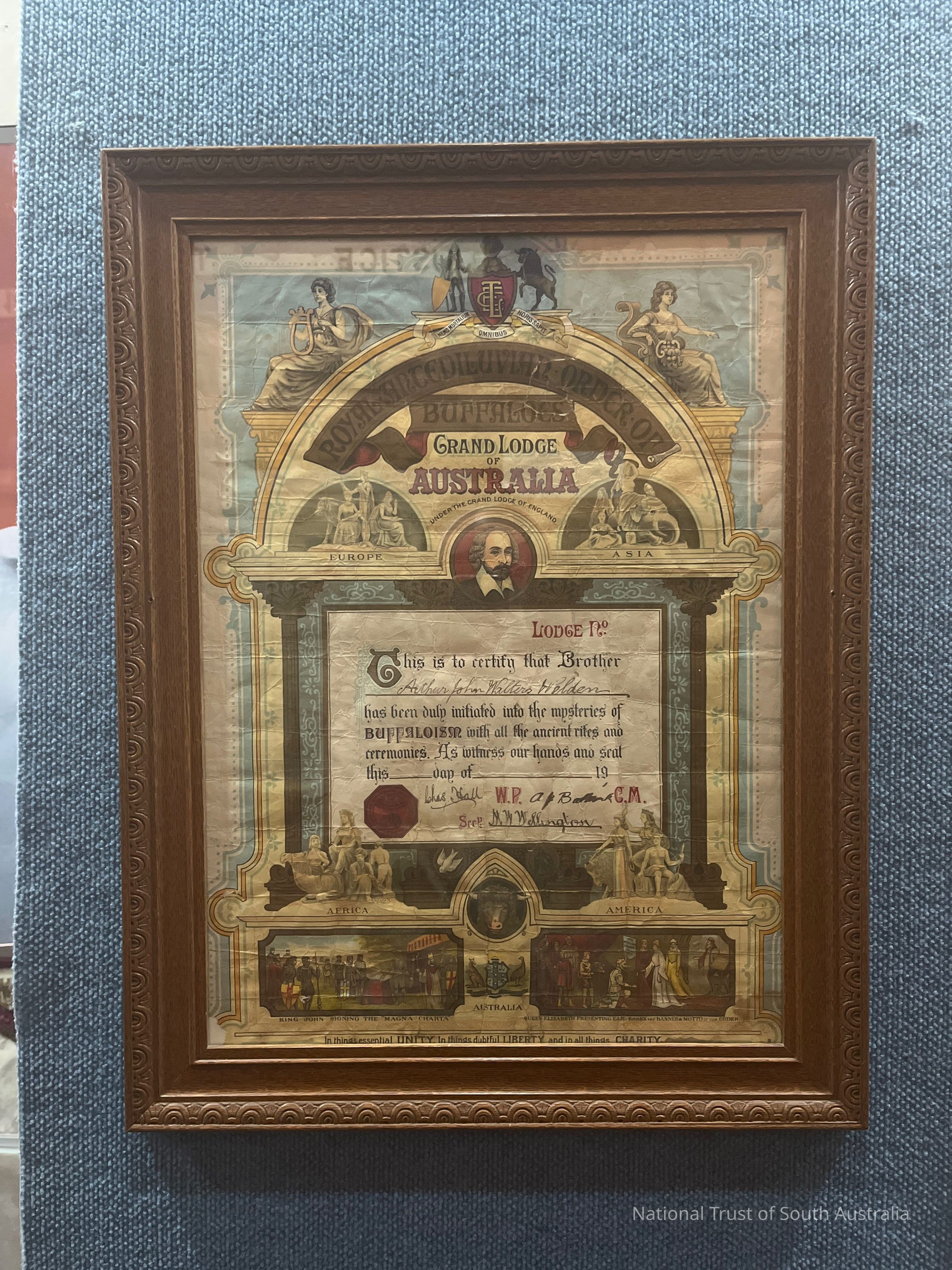Royal Antediluvian Order of Buffaloes initiation certificate