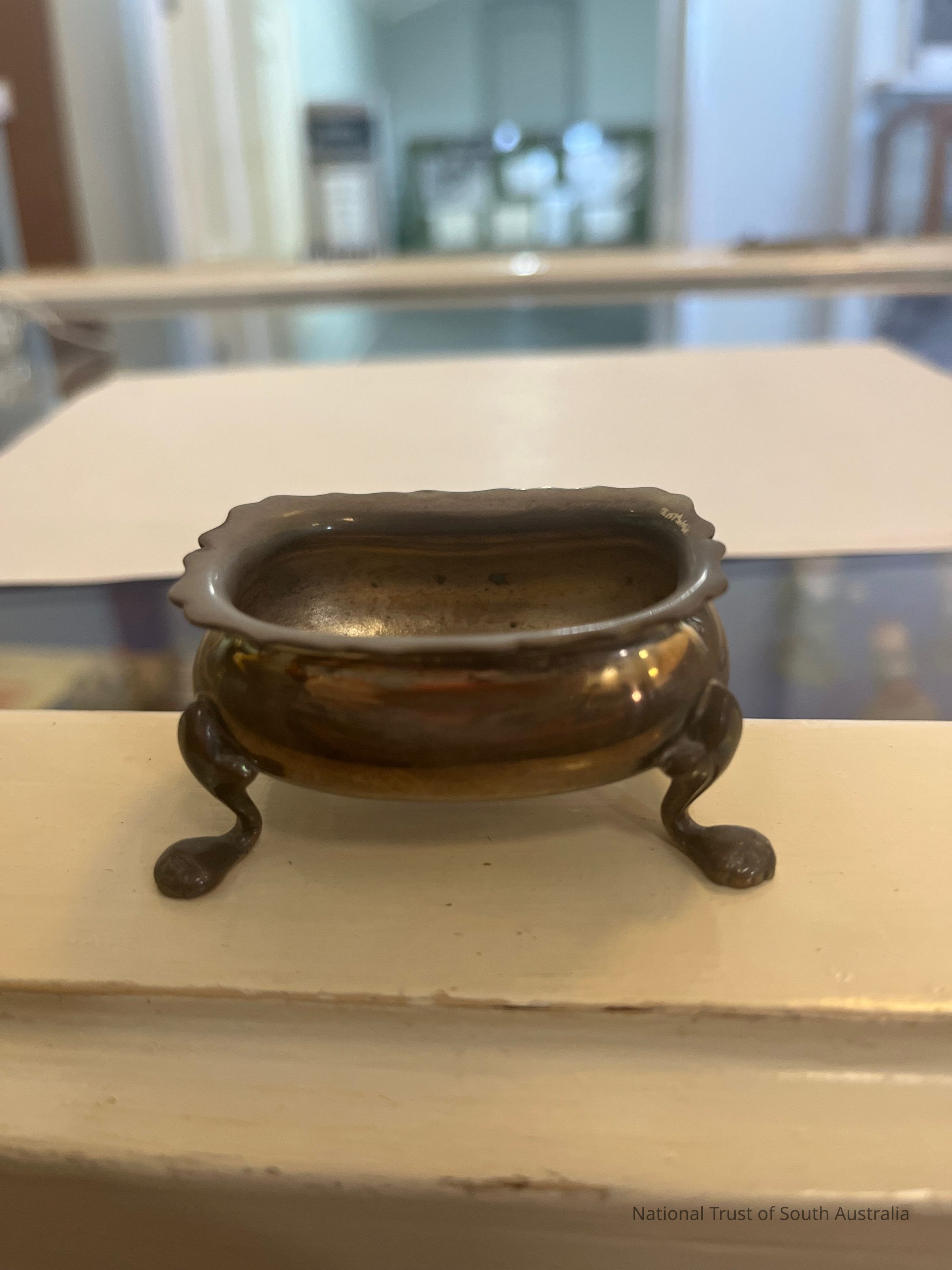 Silver salt cellar and spoon Text: Strahan EPNSA