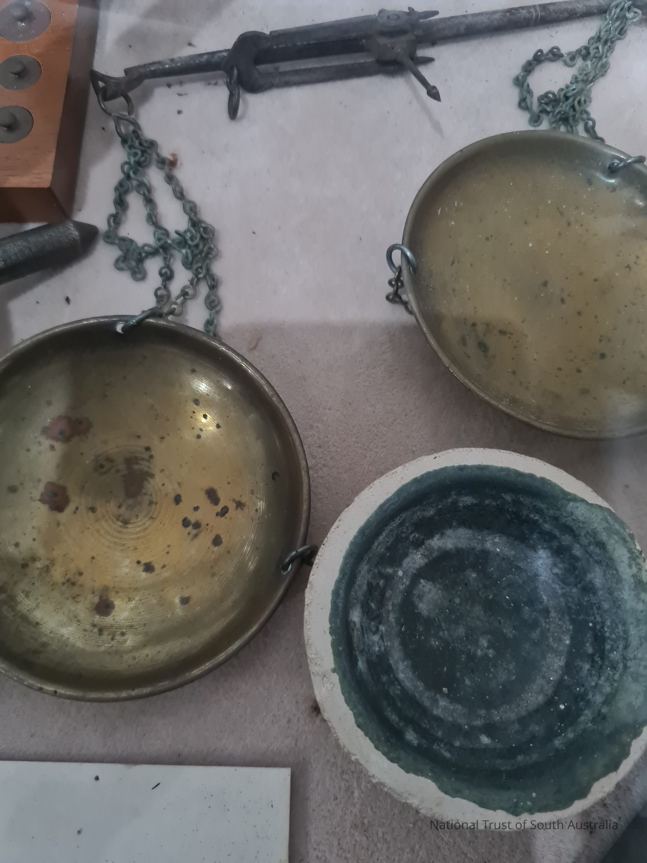 Gold scales and pottery cup. Donated by Mrs G. Nankival