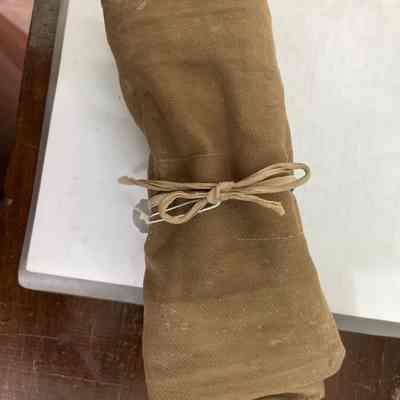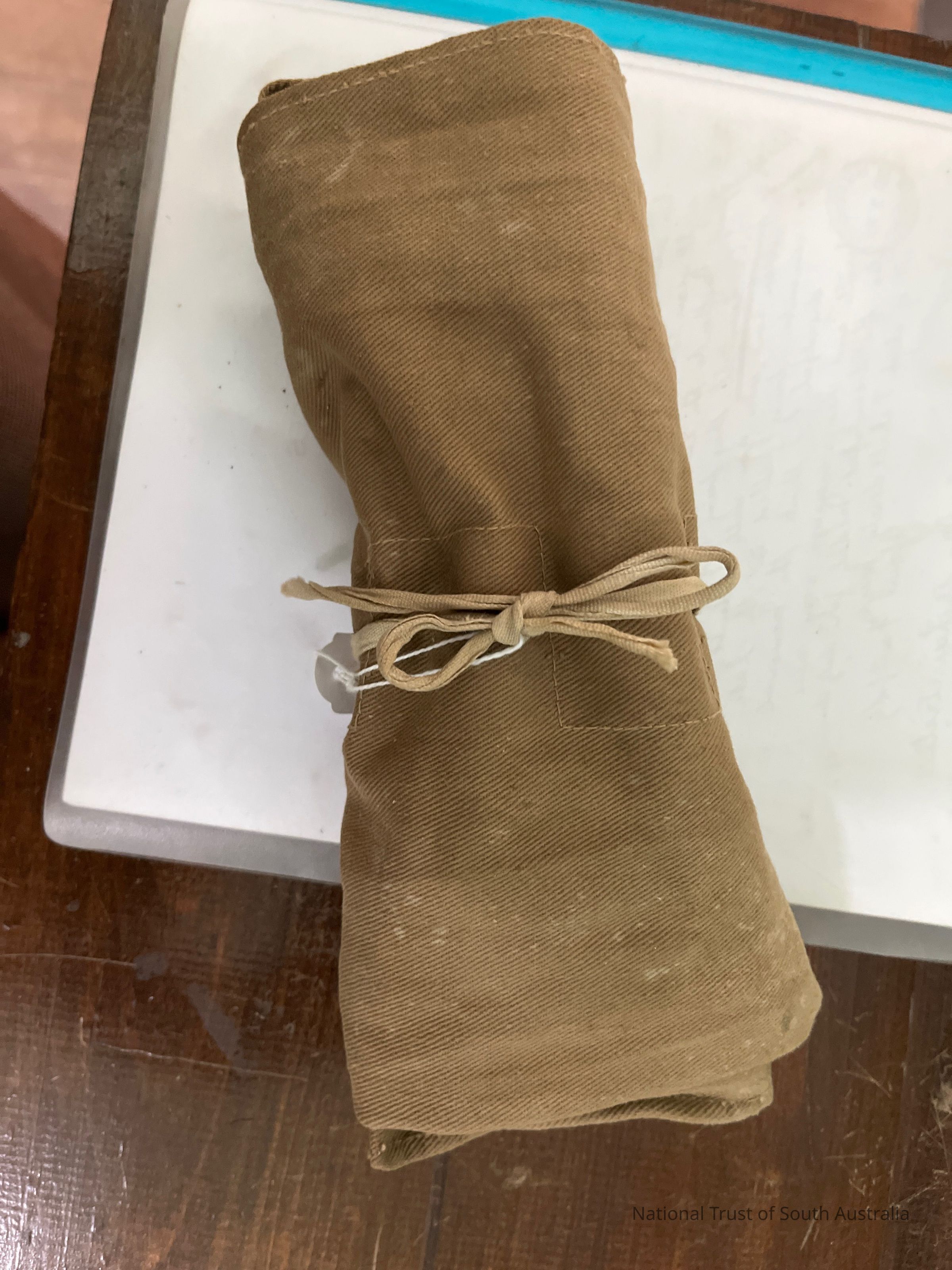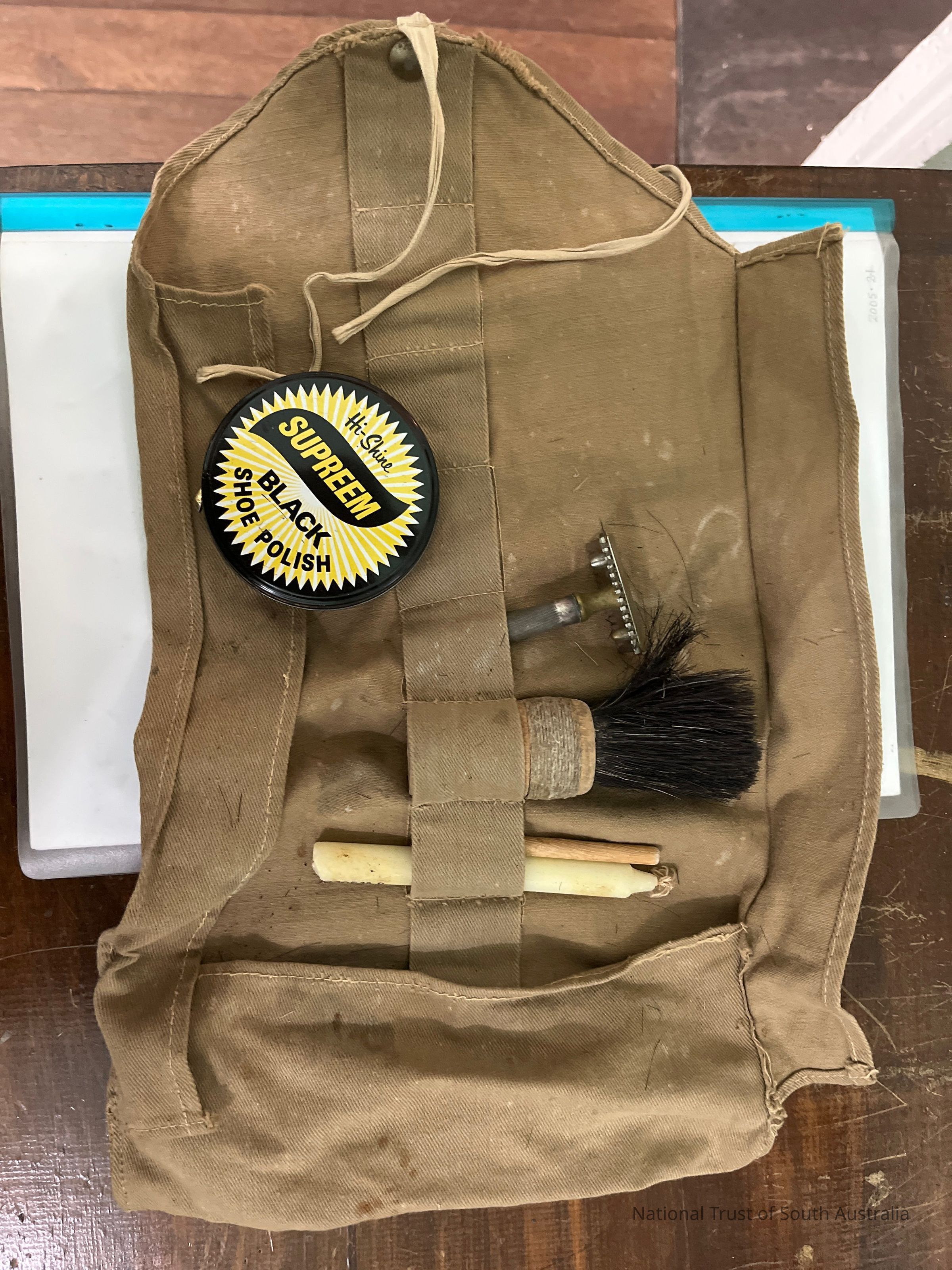Includes shaving razor, brush, candle, and black shoe polish tin. Rolls up into packable form.