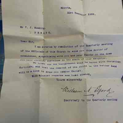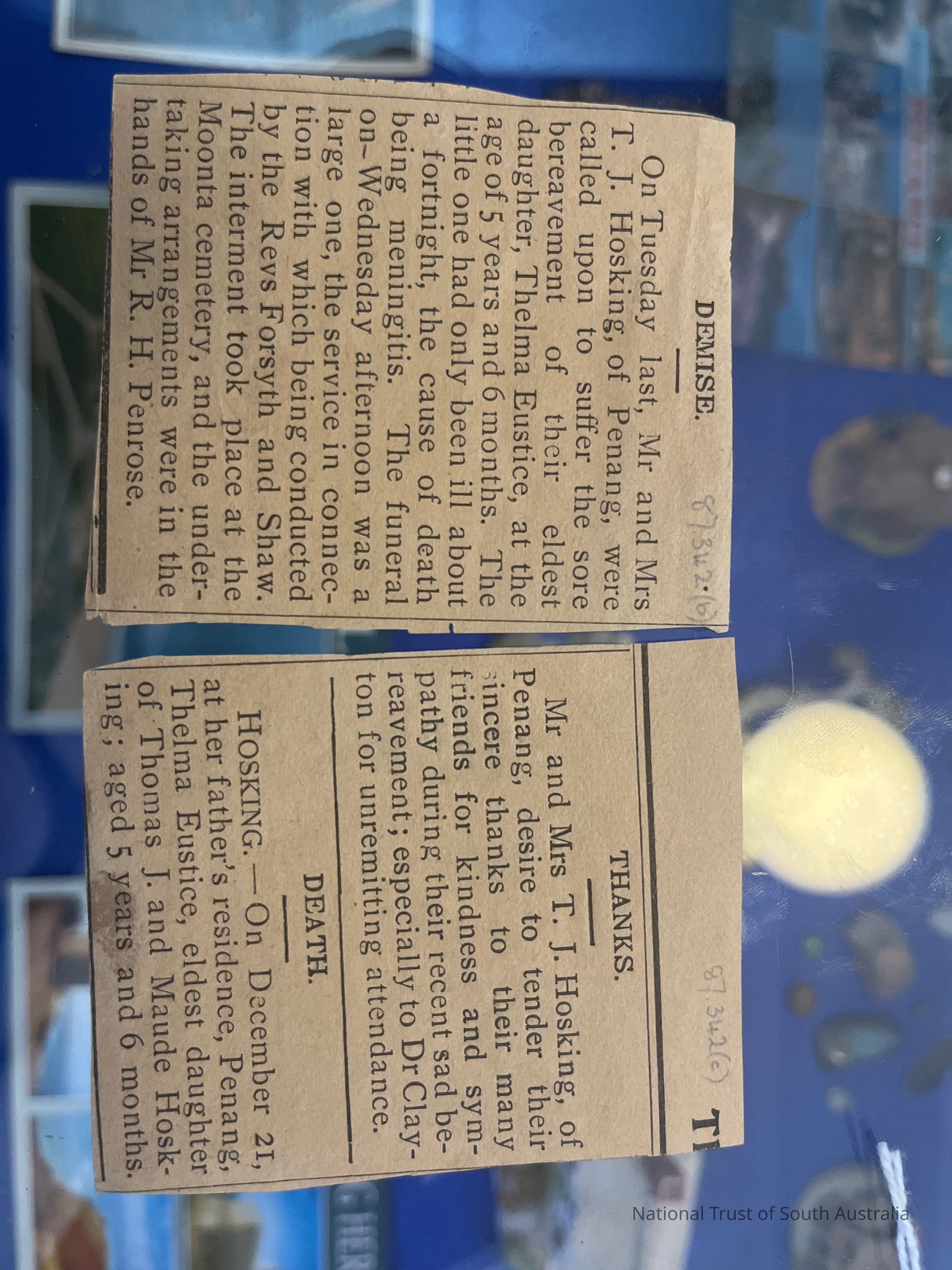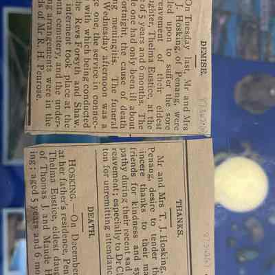 All of these items are related to the death of little Thelma Eustice, Tom and Maud Hosking’s eldest daughter. Thelma died at 5 years old in 1909 from meningitis.Collection