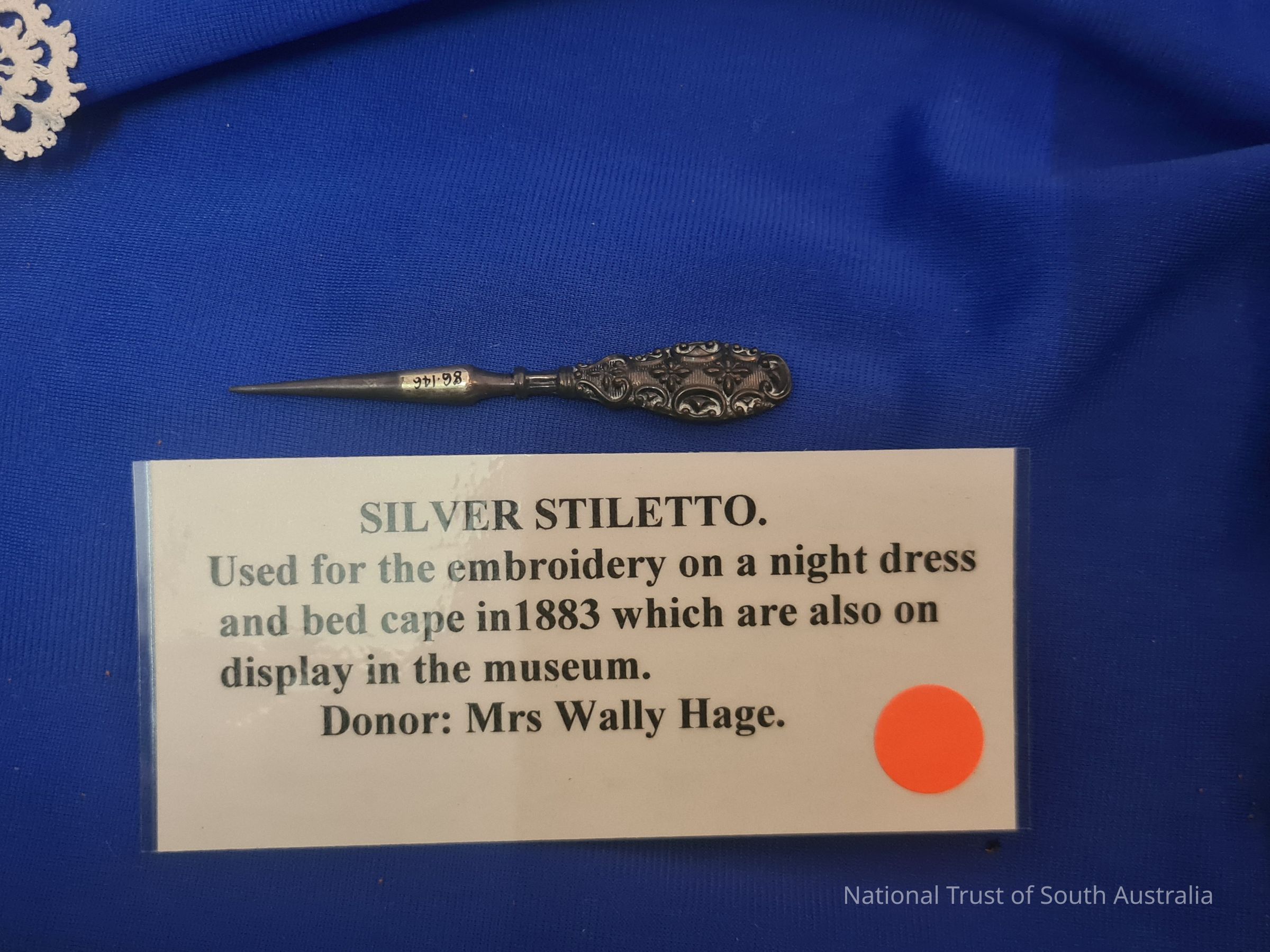 Silver stiletto used for the embroidery on a night dress and bed cape in1883 also on display in museum. Donated by Mrs Wally HageCollection