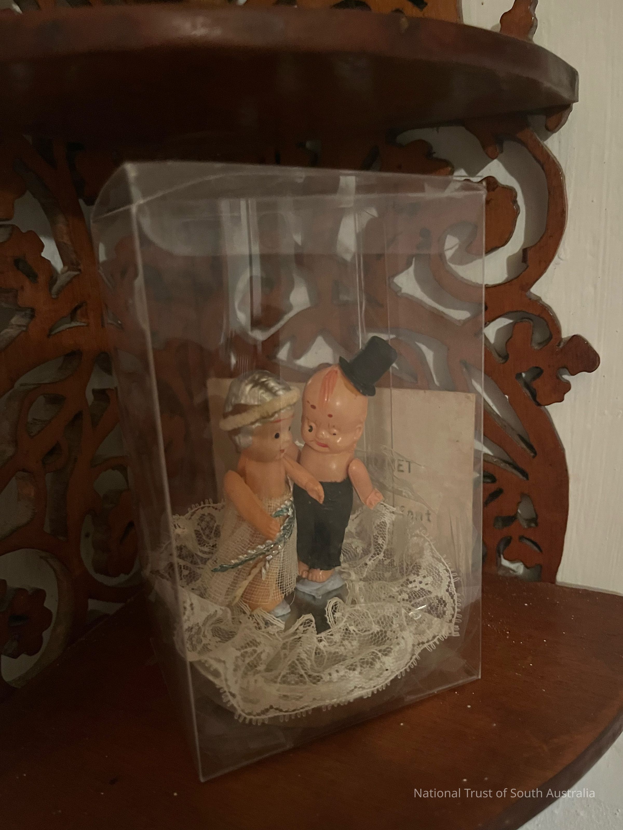 Two small dolls dressed in wedding outfits