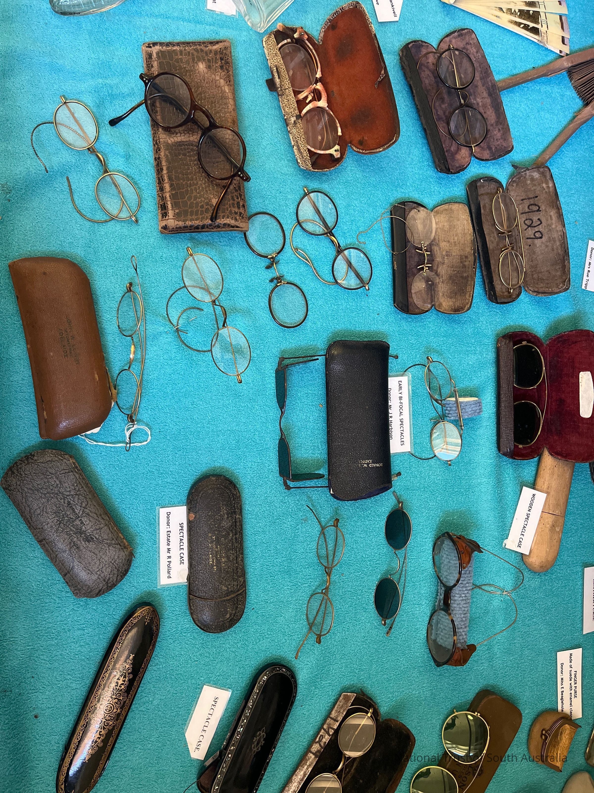 Collection of spectacles and cases. Includes 19 spectacles and 15 cases. Cases made from wood, leather and lacquer.