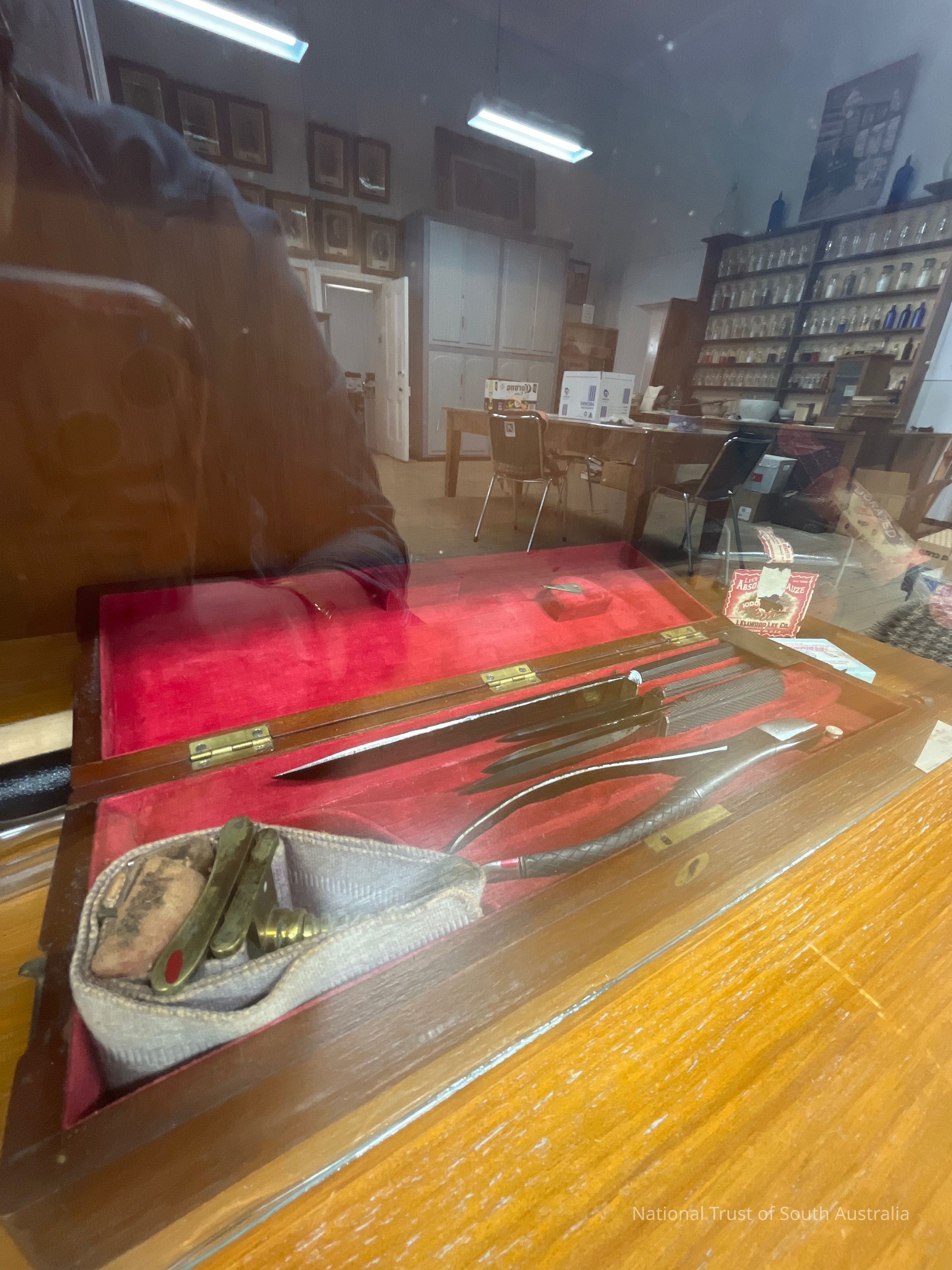 Scalpels, knives, large scissors and fabric cuff in a wooden vase lined with velvet