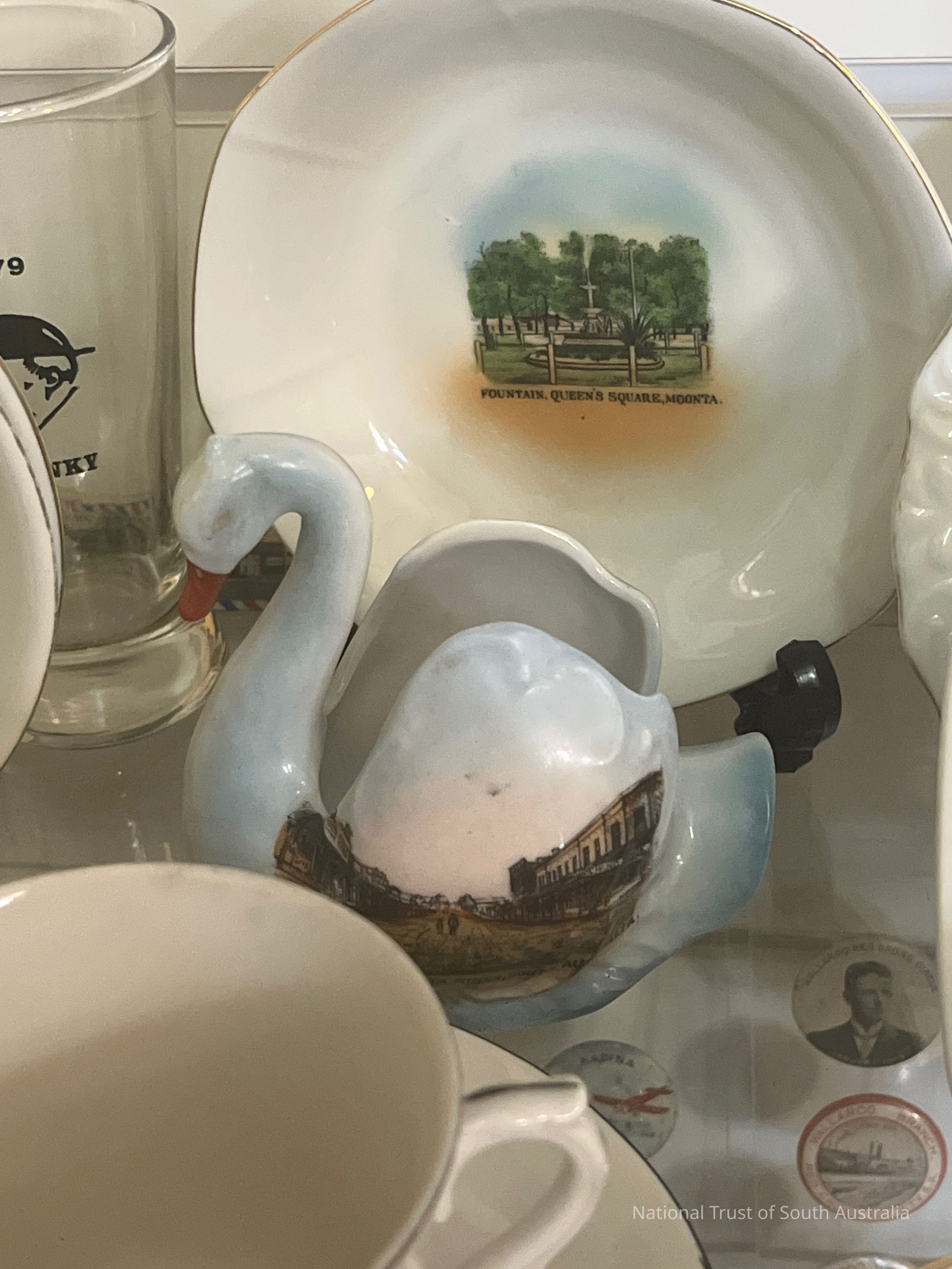 Swan shaped ornament with open top. Features a scenic illustration and the words: Ellen Street, Moonta Mines, South Australia.