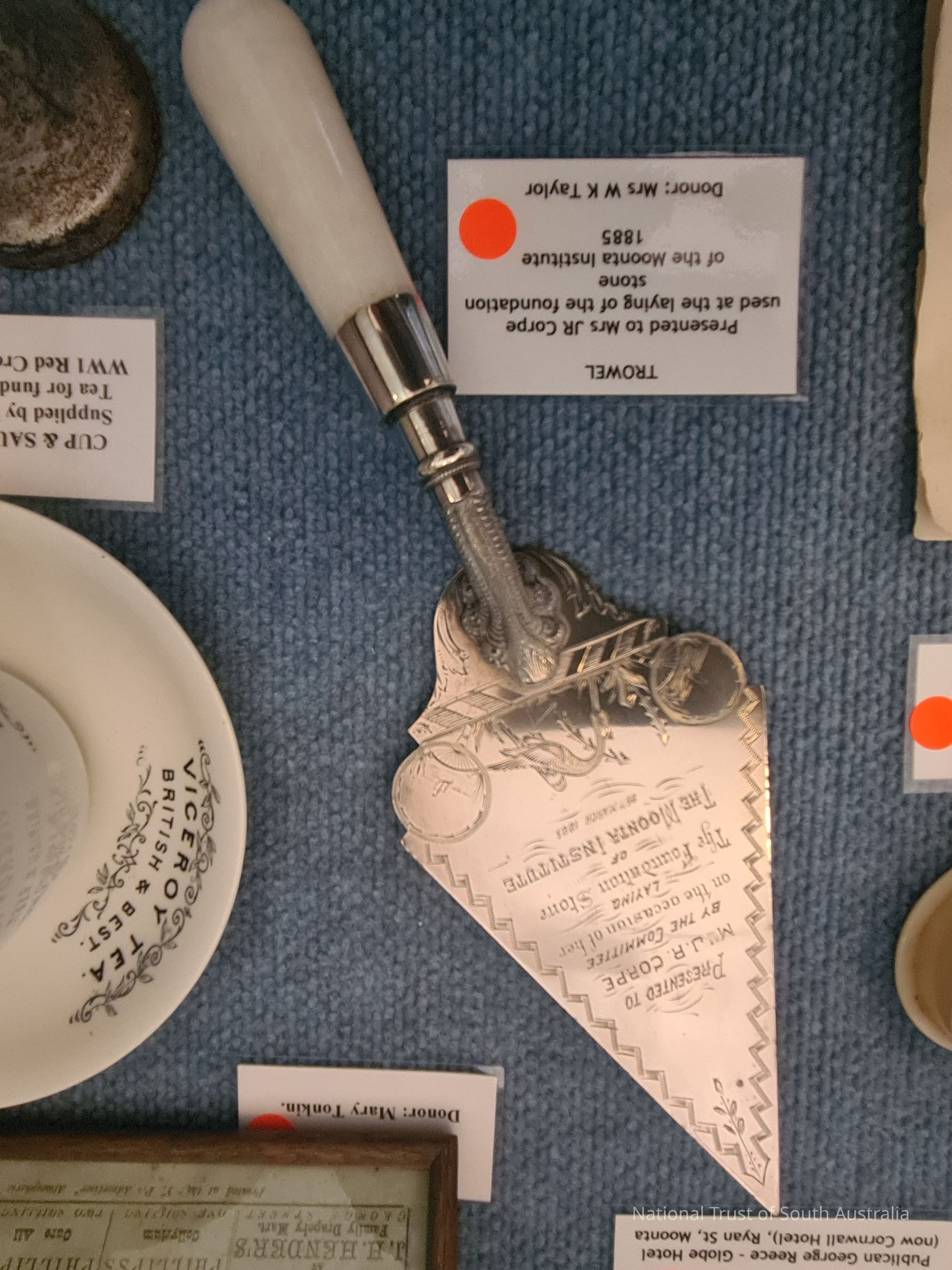 Trowel presented to Mrs J.R. Corner used at the laying of foundation stone Moonta Institute 1885. Donated by Mrs. W. K. Taylor