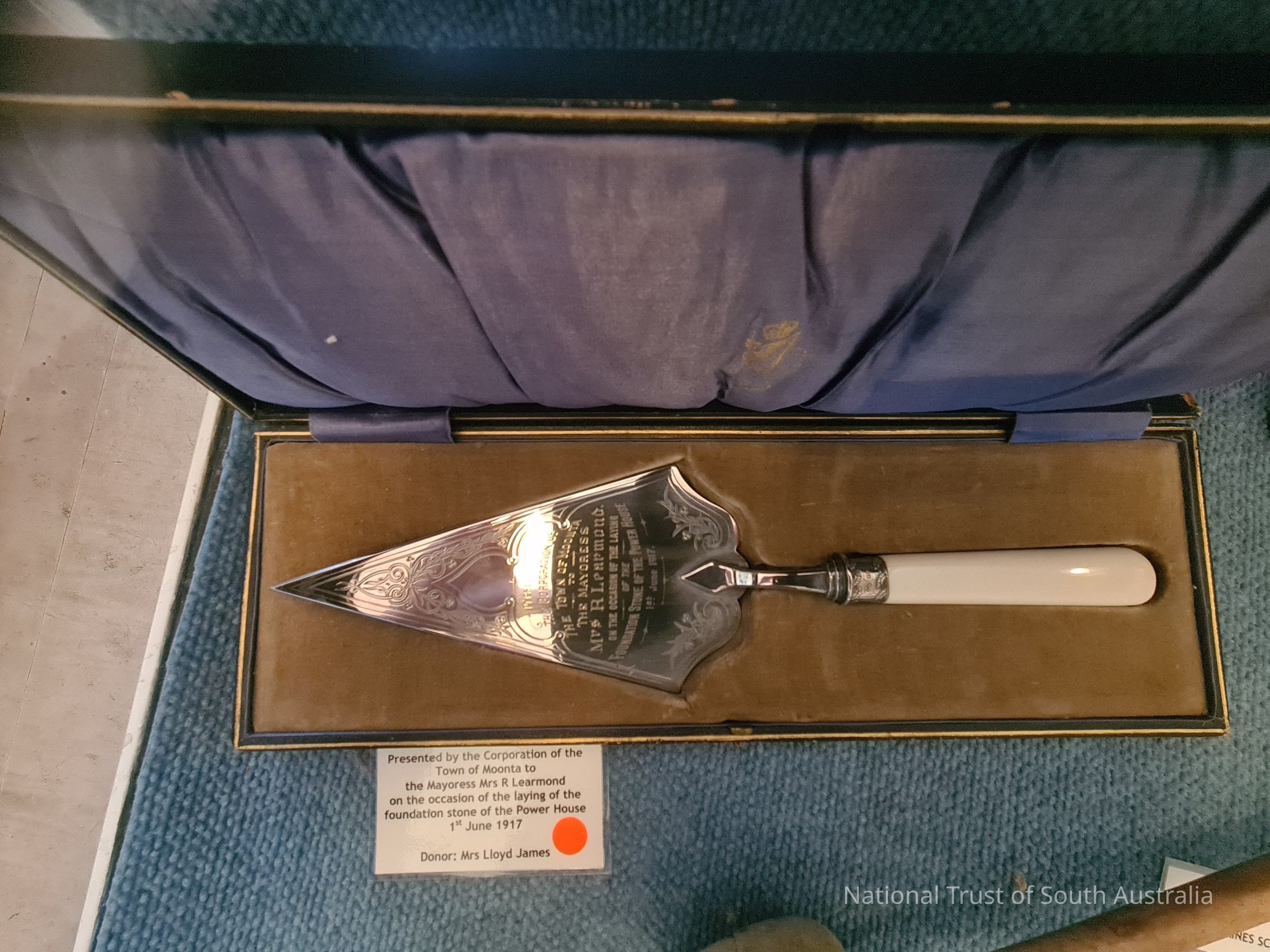 Trowel presented by Corporation of the Town of Moonta to the Mayoress Mrs R. Learmond on the occasion of the laying of the foundation stone of the power house. 1 June 1917. Donated by Mrs Lloyd Jones.Collection
