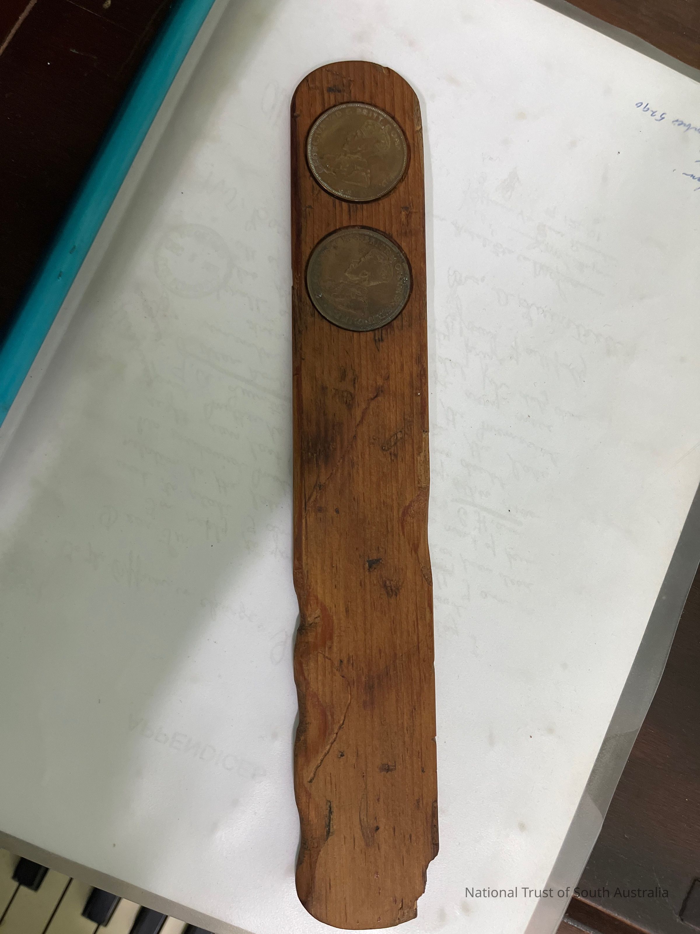 Two pennies, one issued in 1919 and one issued in 1923, encased in wooden throwing stick.