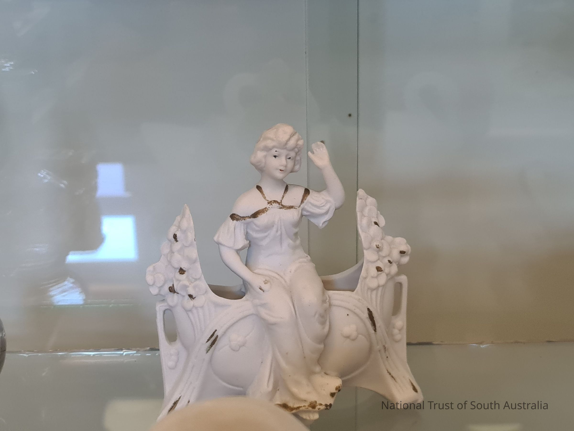 White. Girl sitting on bench waving. Donated by Mrs Trezise