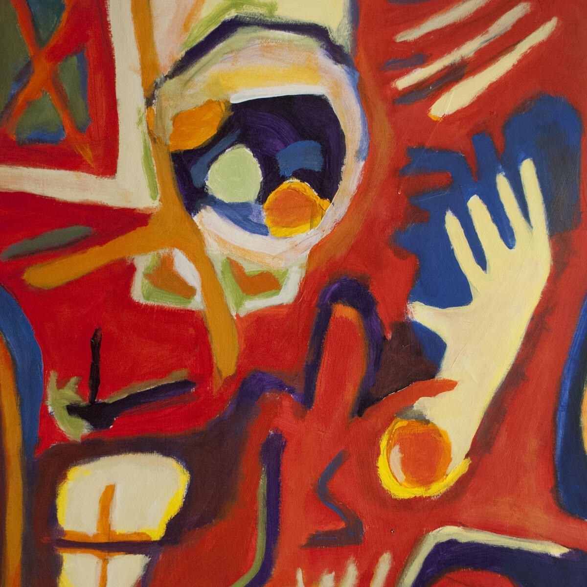 Pinholes in each corner. Chipped paint adhered to image off-center. Otherwise in good condition. Figure? Red series.Location