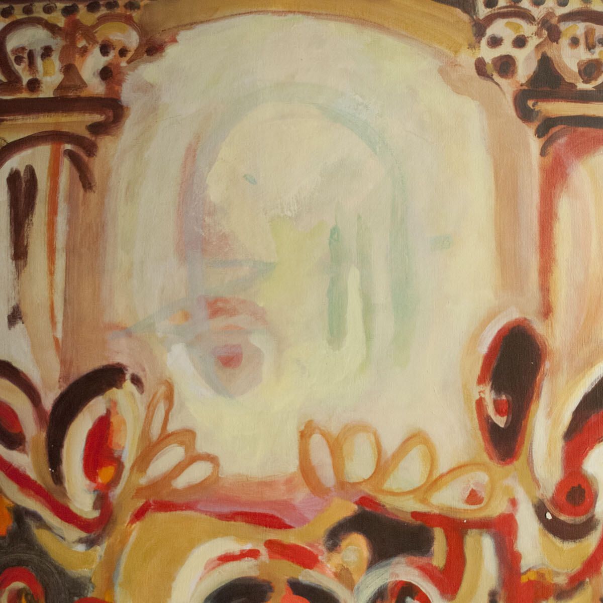 Abrasions, one affecting image in top-left corner, smudges in borders. Paint chips adhered to image, some paint transfer. Interior scene, opera house. Viterbo series. portal, white, orange, brown, redDimensions