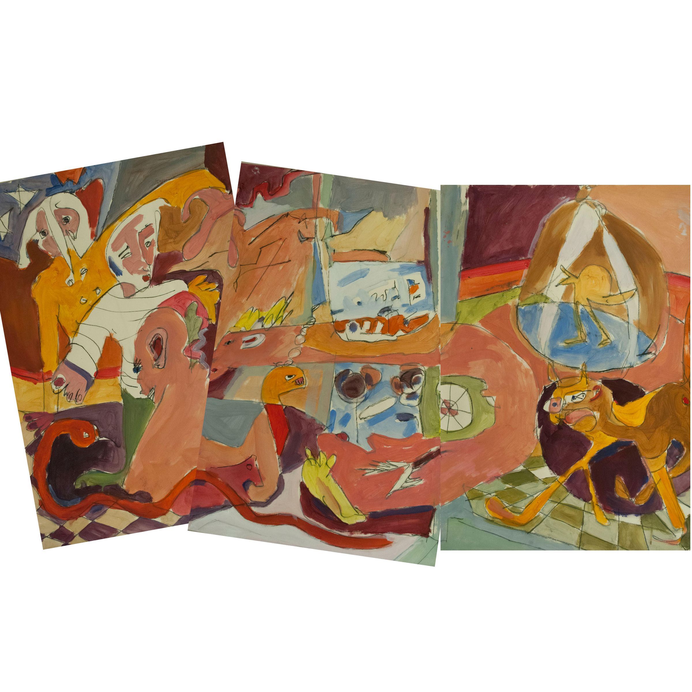 Image covers 3 sheets, staggered in a row. Pinholes in corners of each. Abrasions in .c, smudges and pigment transfer throughout each. Tear in non-image area of .a Dream, circus scene?Artwork Details