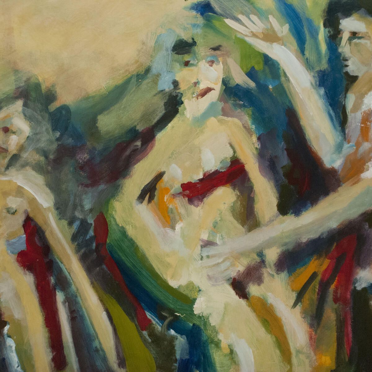 Bleed image, multiple pinholes in corners. Tear in top edge, tear at bottom left edge. Points of paint transfer throughout image. Two sheets adhered together to form larger image area. Three figures.Dimensions