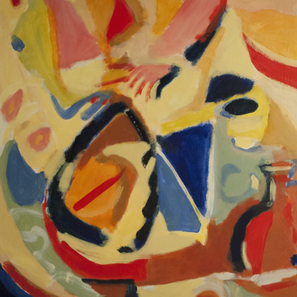 Dark, raised areas have paper adhered in image. Abrasions and smudges in borders. Abstract figure, still life. Columbus Ave. series.Location