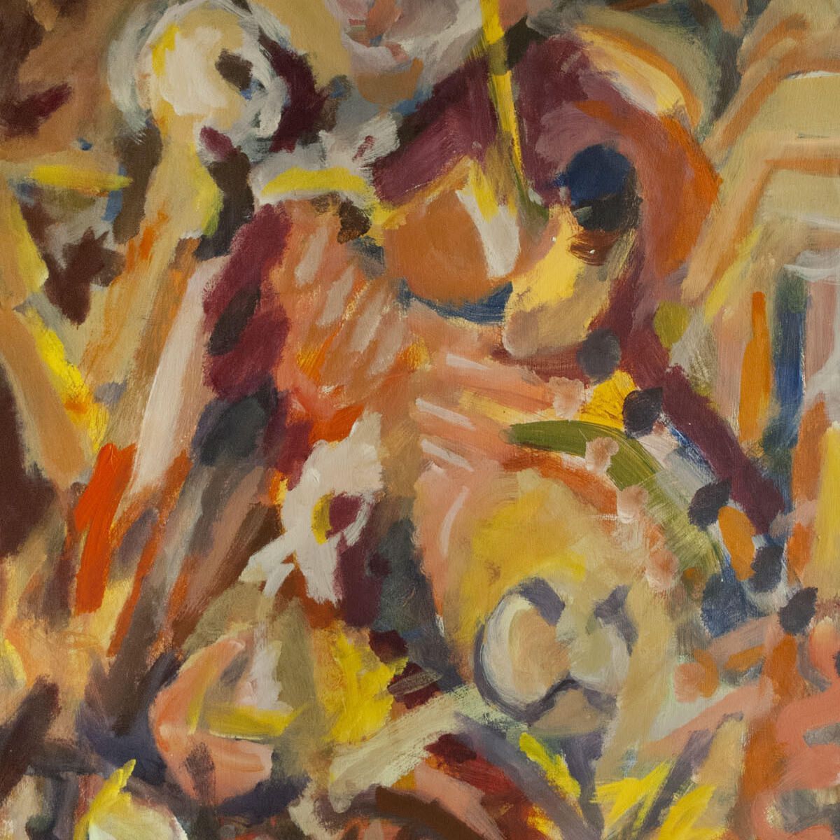 Bleed image. Tears and pinholes in corners. White paint transferred from another image in upper-right quadrant. Abstracted figure reclining.Location