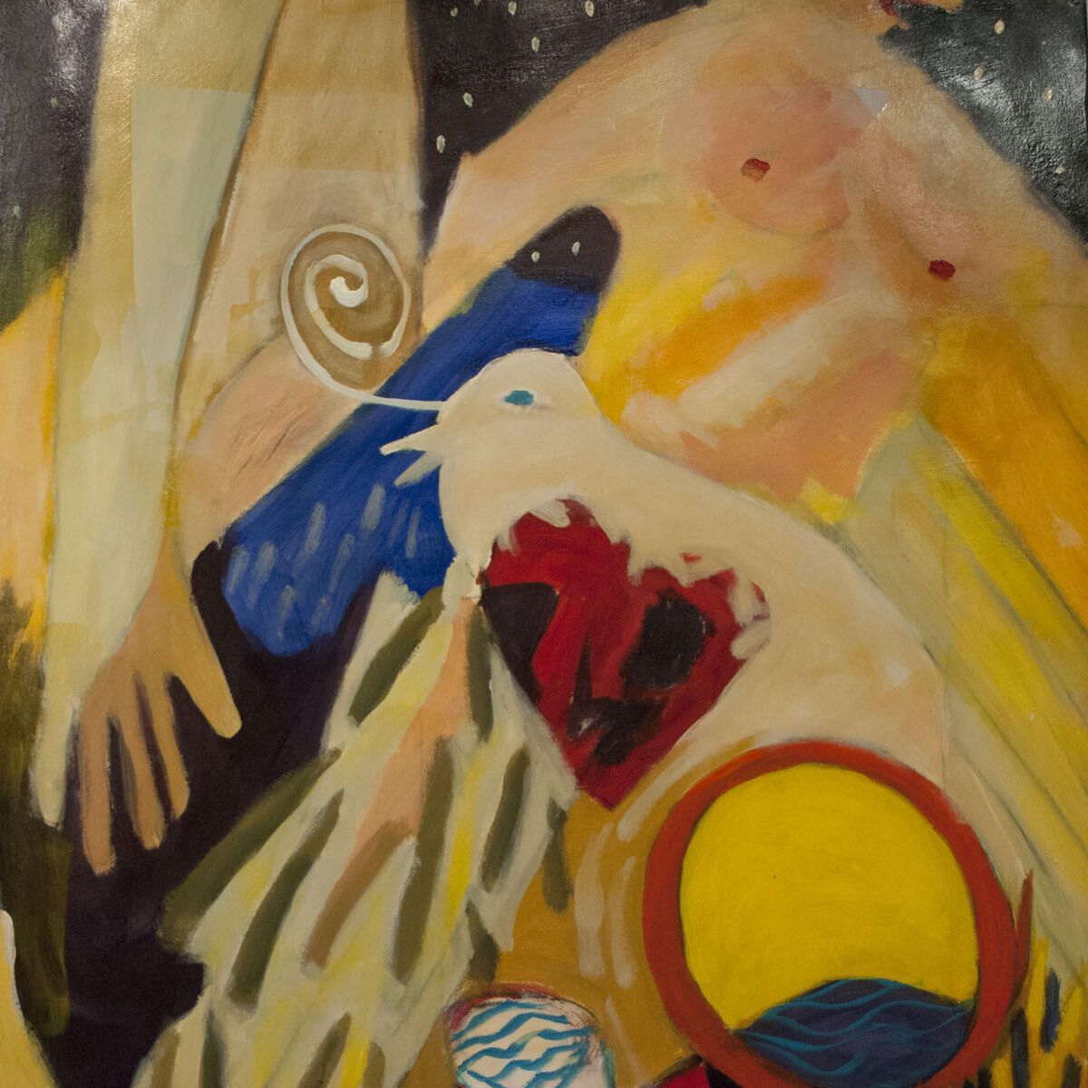 Pinholes in corners of image. Small points of white paint transfer. Symbolic image with human figures.Location