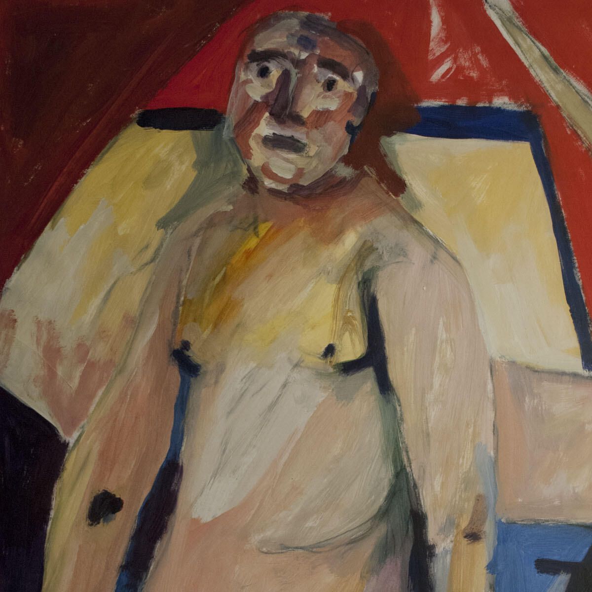 Bleed image, multiple pinholes in corners. Small points of pigment (black and red) throughout image. Large tear in left edge, well into image, repaired by artist with scrap paper and acrylic medium. Male nude figure.Artwork Details