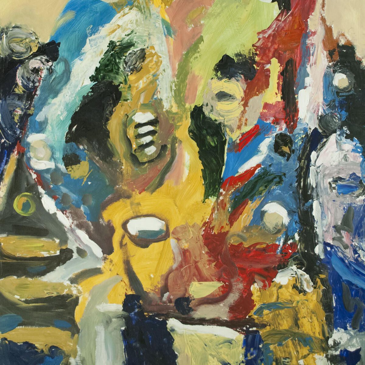 Multiple pinholes in top corners. Tears in left, bottom borders. Bottom tear going into image. Image torn, repaired by artist with scrap paper and acrylic medium. Two figures.Location