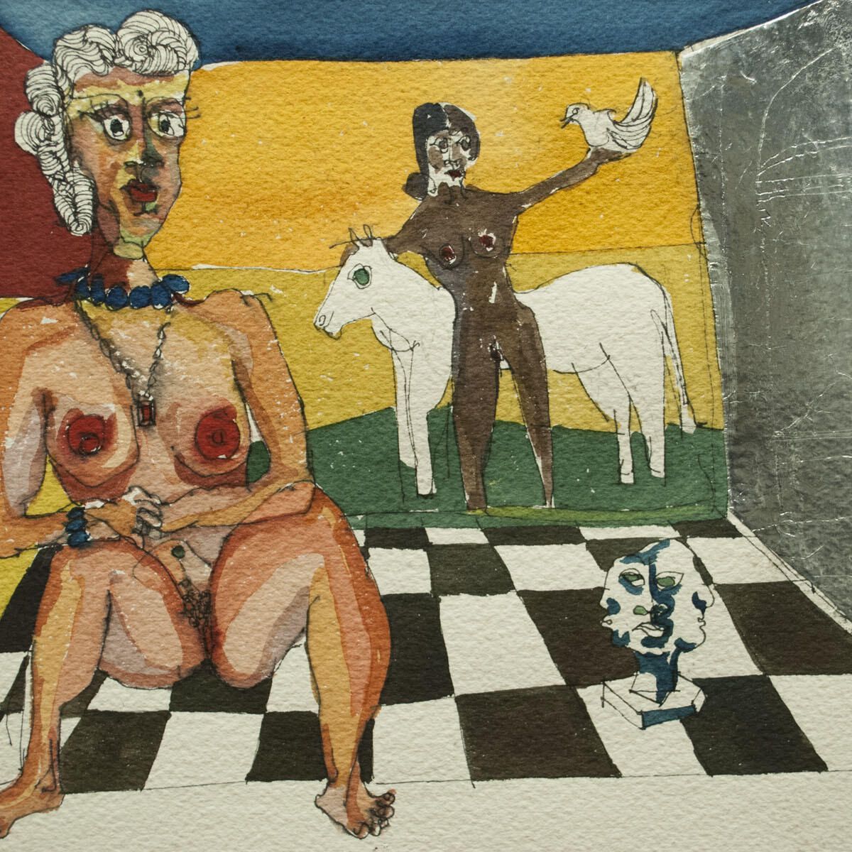 Some pencil marks, smudges in borders. Poorly matted with masking tape. Image in good condition. Two nude female figures.Artwork Details