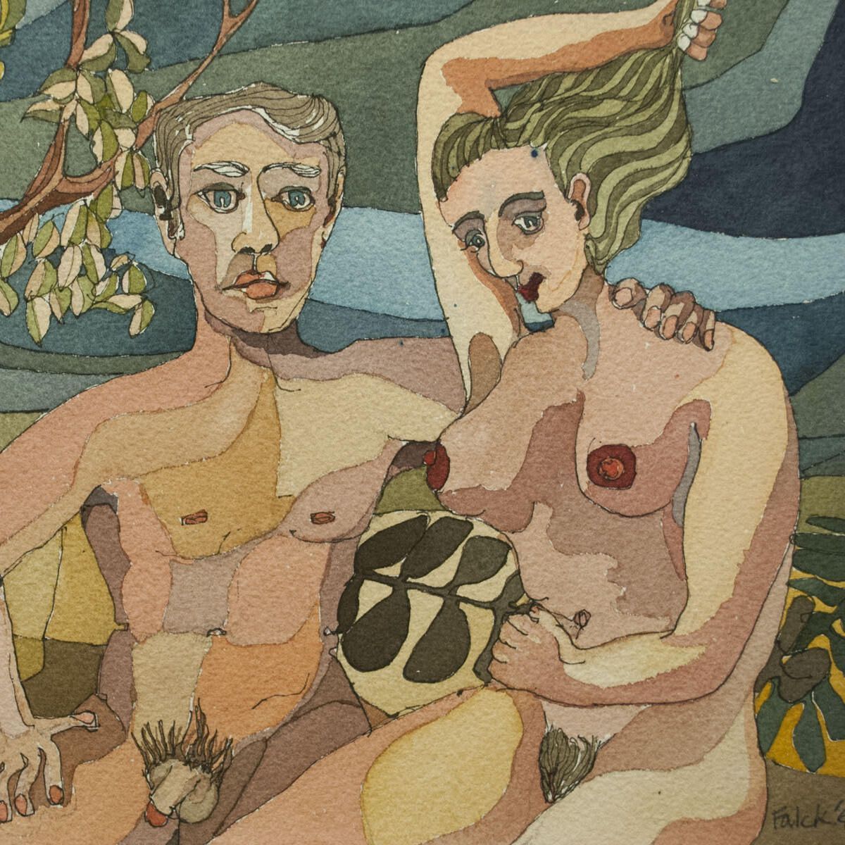 Tape adhesive remaining on back. Few points of light foxing in borders. Nude man and woman.Artwork Details