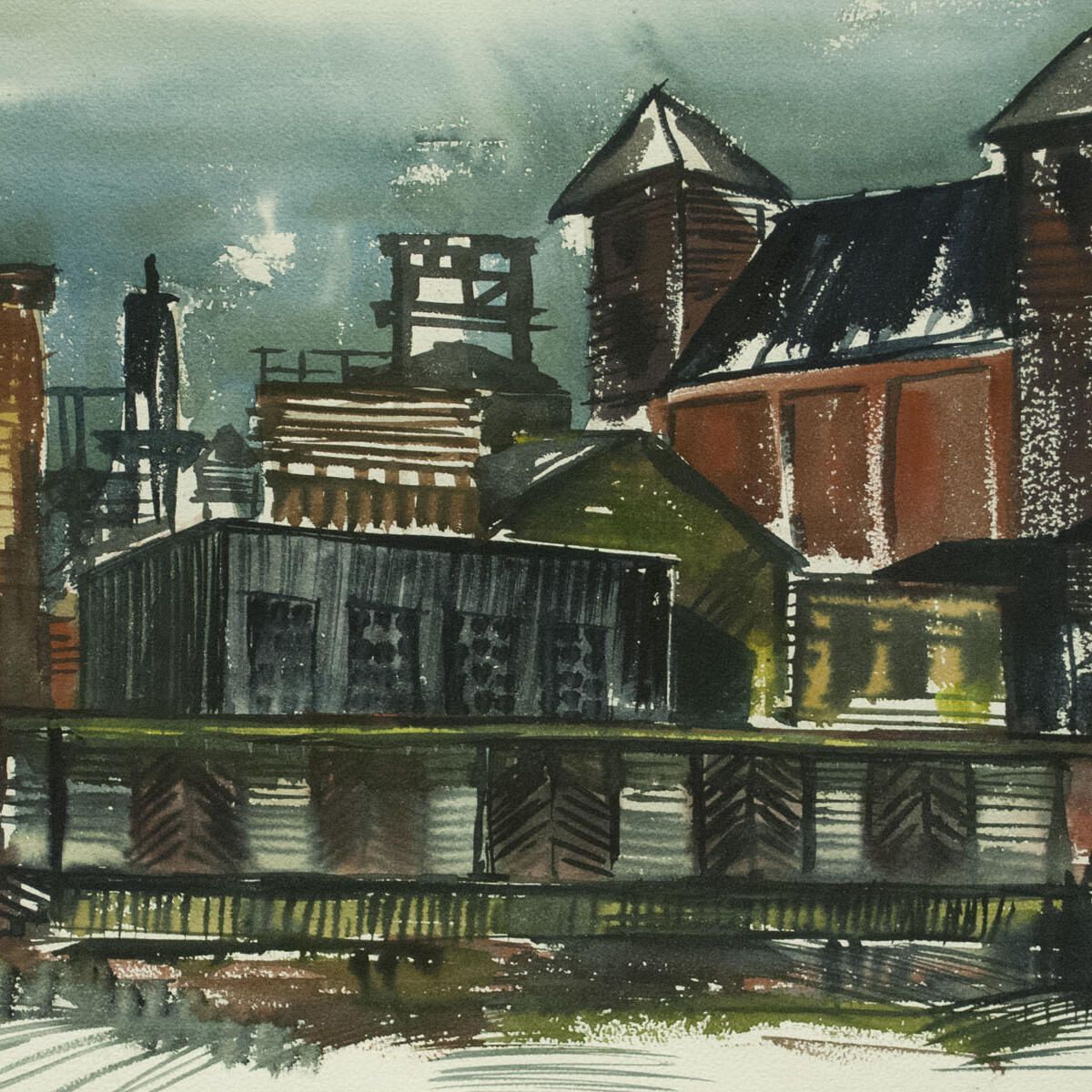 Foxing, smudges in borders. Tape adhesive remaining in borders. Cityscape.Location