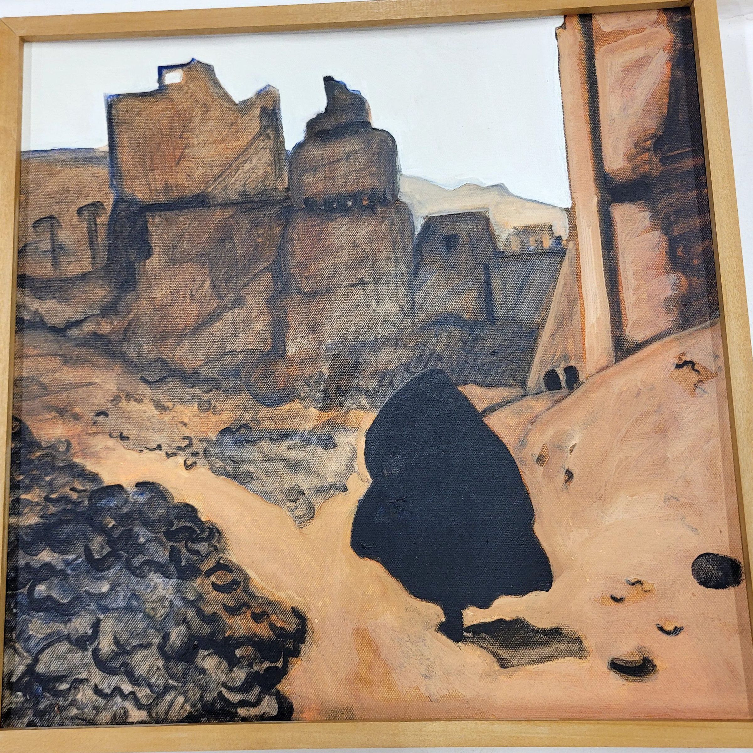 A vaguely triangularly shaped black figure walks into a partly demolished city. Bottom left is filled with rubble. Bottom right has Pete's iconic black fingerprint.9/11, destruction, city, human, figureType of Painting