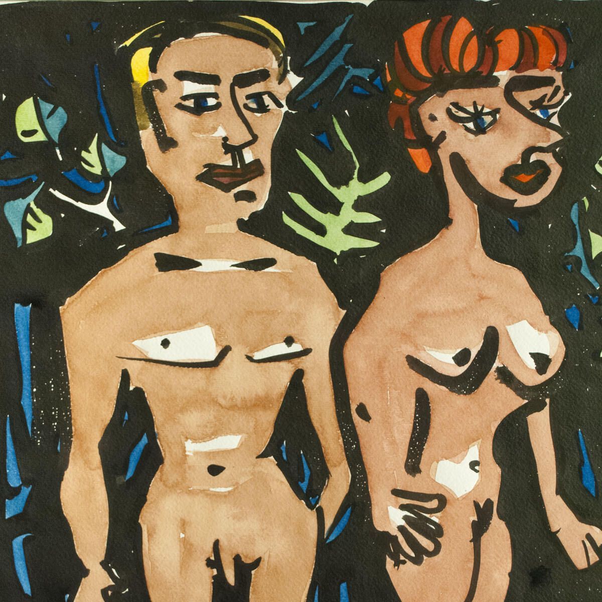 Poorly matted with masking tape. Image in good condition. Two figures-Adam and Eve?Location