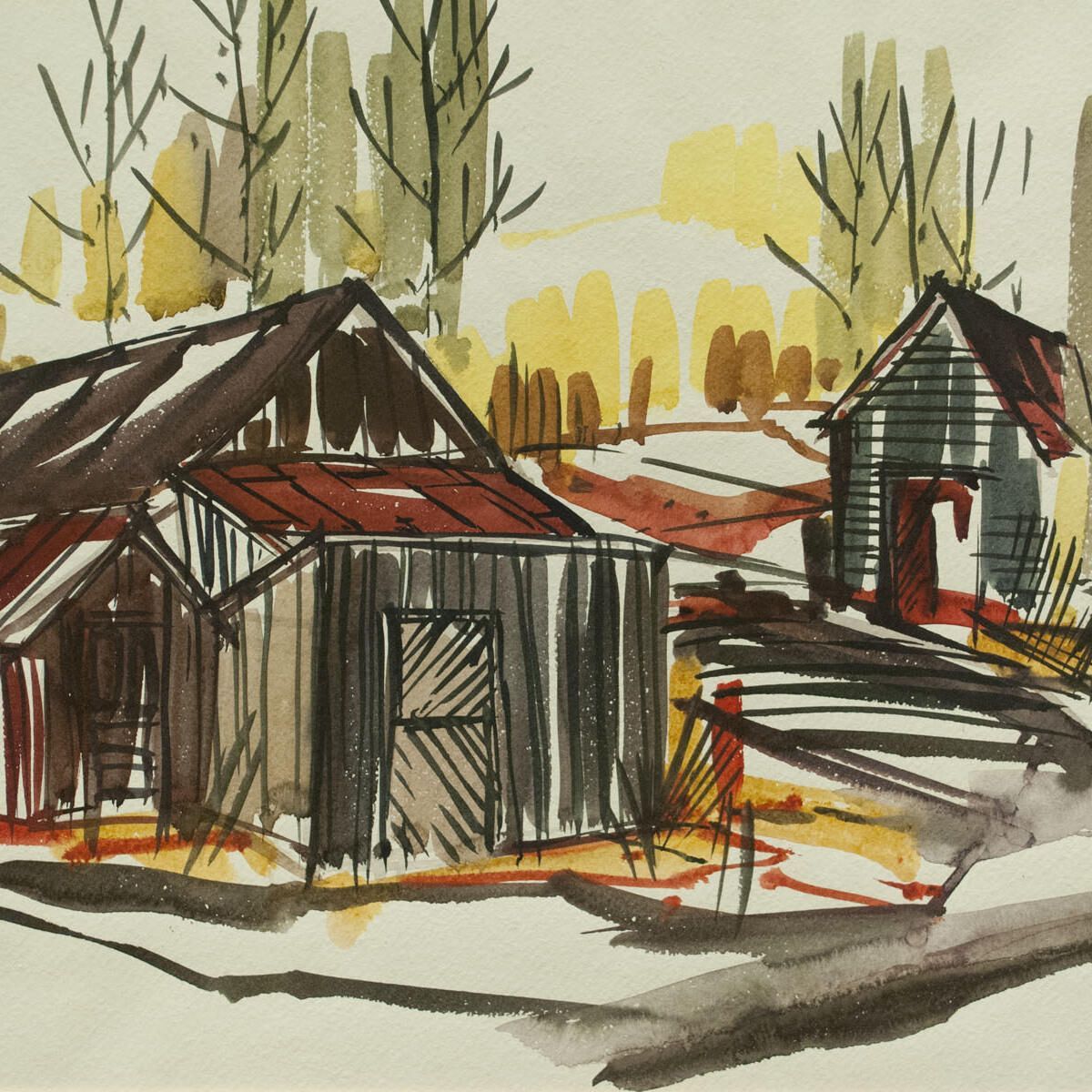 Light foxing at top of image, poorly matted with masking tape. Landscape - architectural study.Location