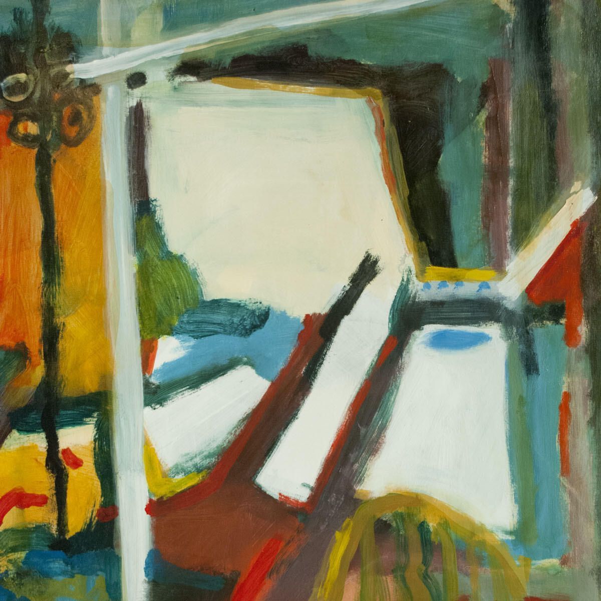 Multiple pinholes in corners, bleed image. Pigment transfer near right edge. Remainder of image in good condition. Interior scene.Location