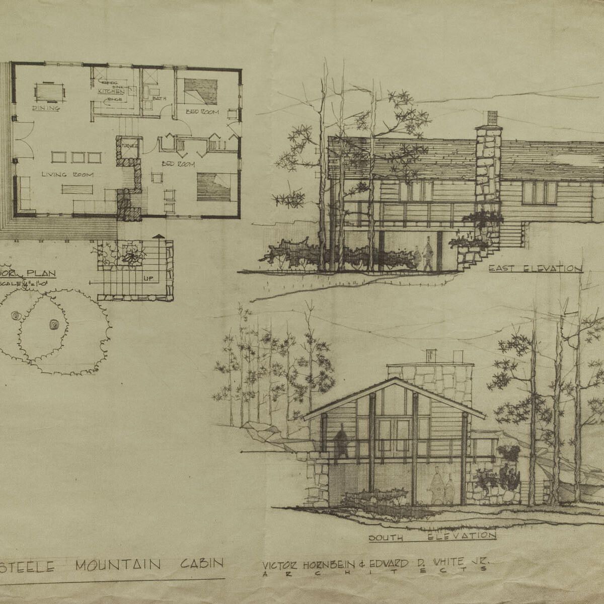 Upper floor plan, south and east elevation. Several small tears in top and bottom edges.Artwork Details