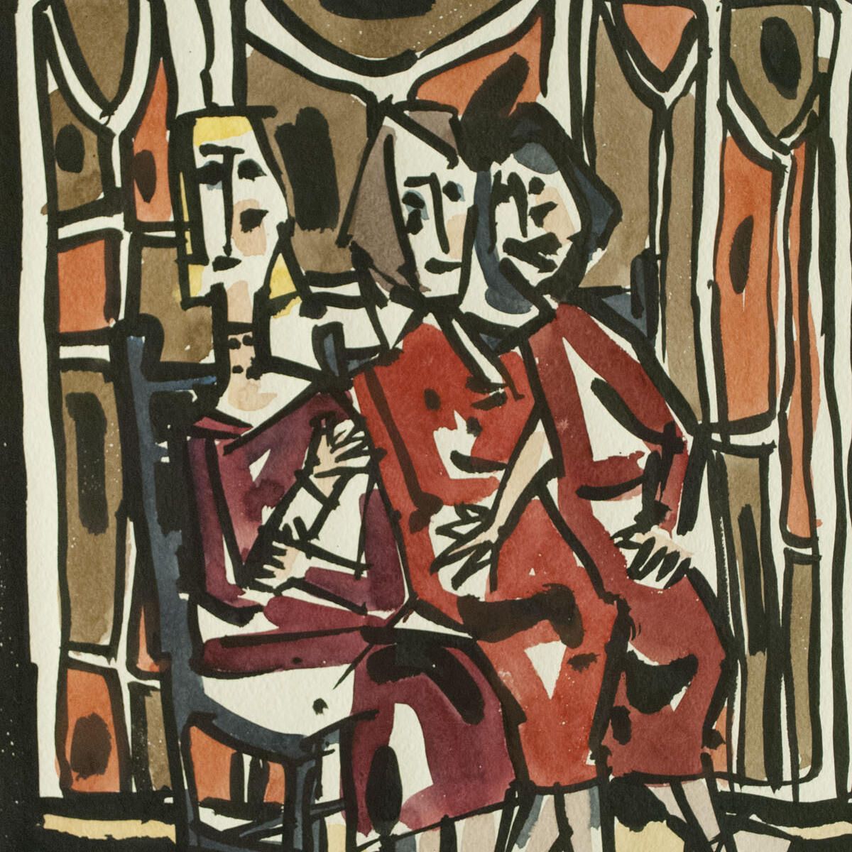 Poorly matted with masking tape. Image in good condition. Three seated figures.Dimensions