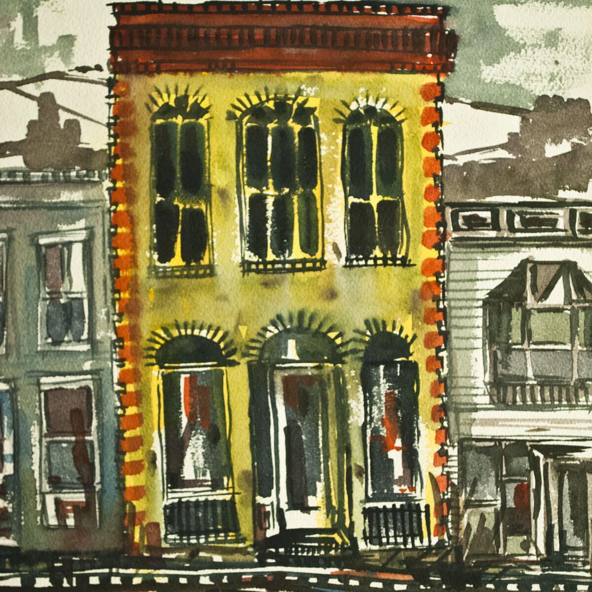 Foxing throughout image, poorly matted with masking tape. Cityscape.Dimensions
