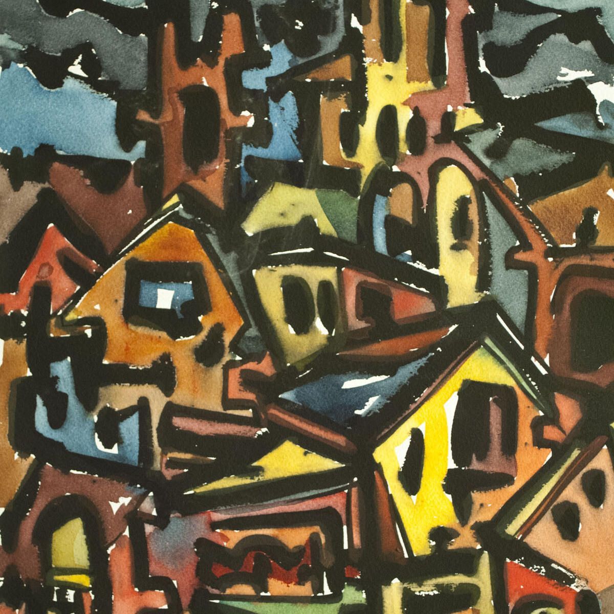 Poorly matted with masking tape, non-archival mat board. Image in good condition. Cityscape.Location