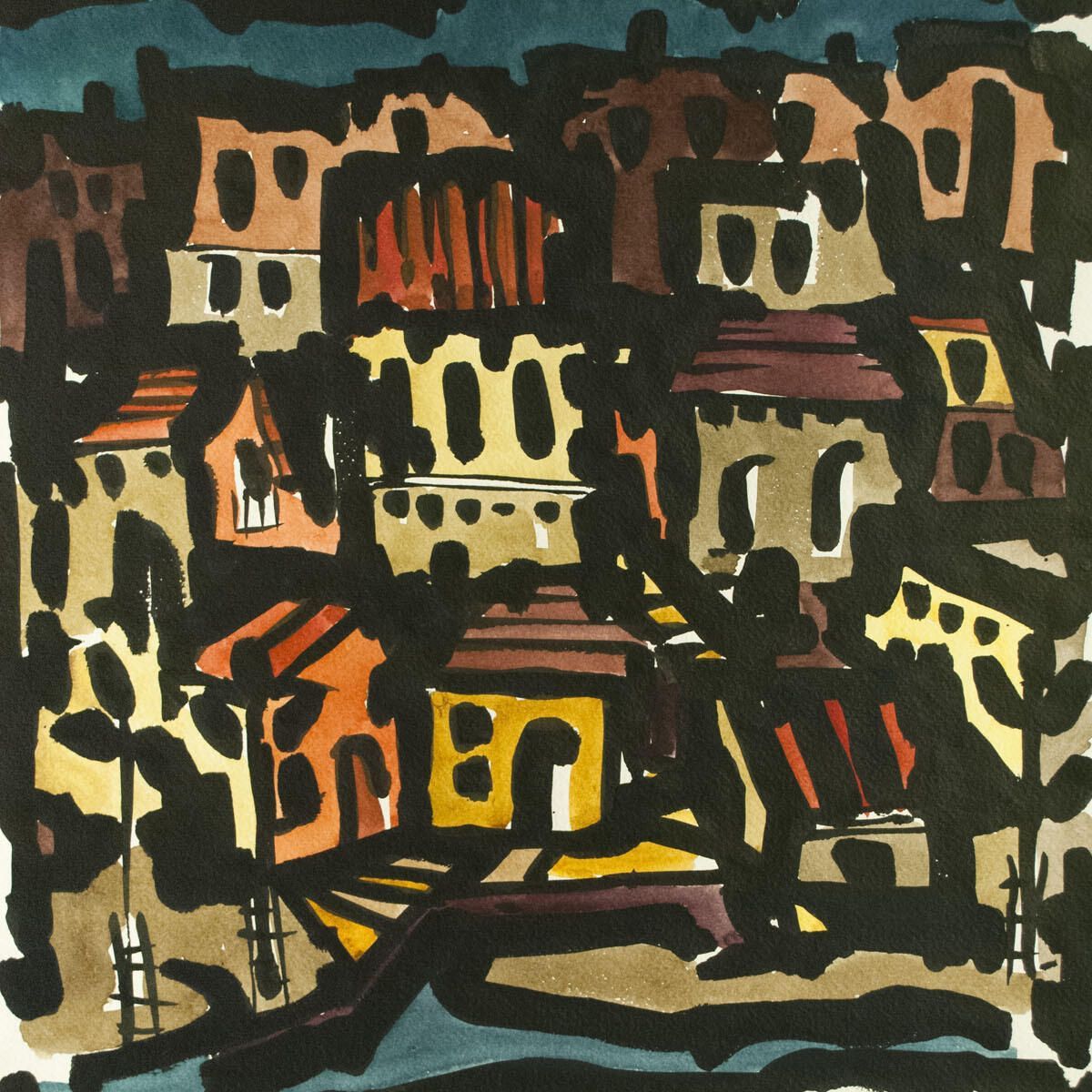 Poorly matted with masking tape. Image in good condition. Townscape.Location