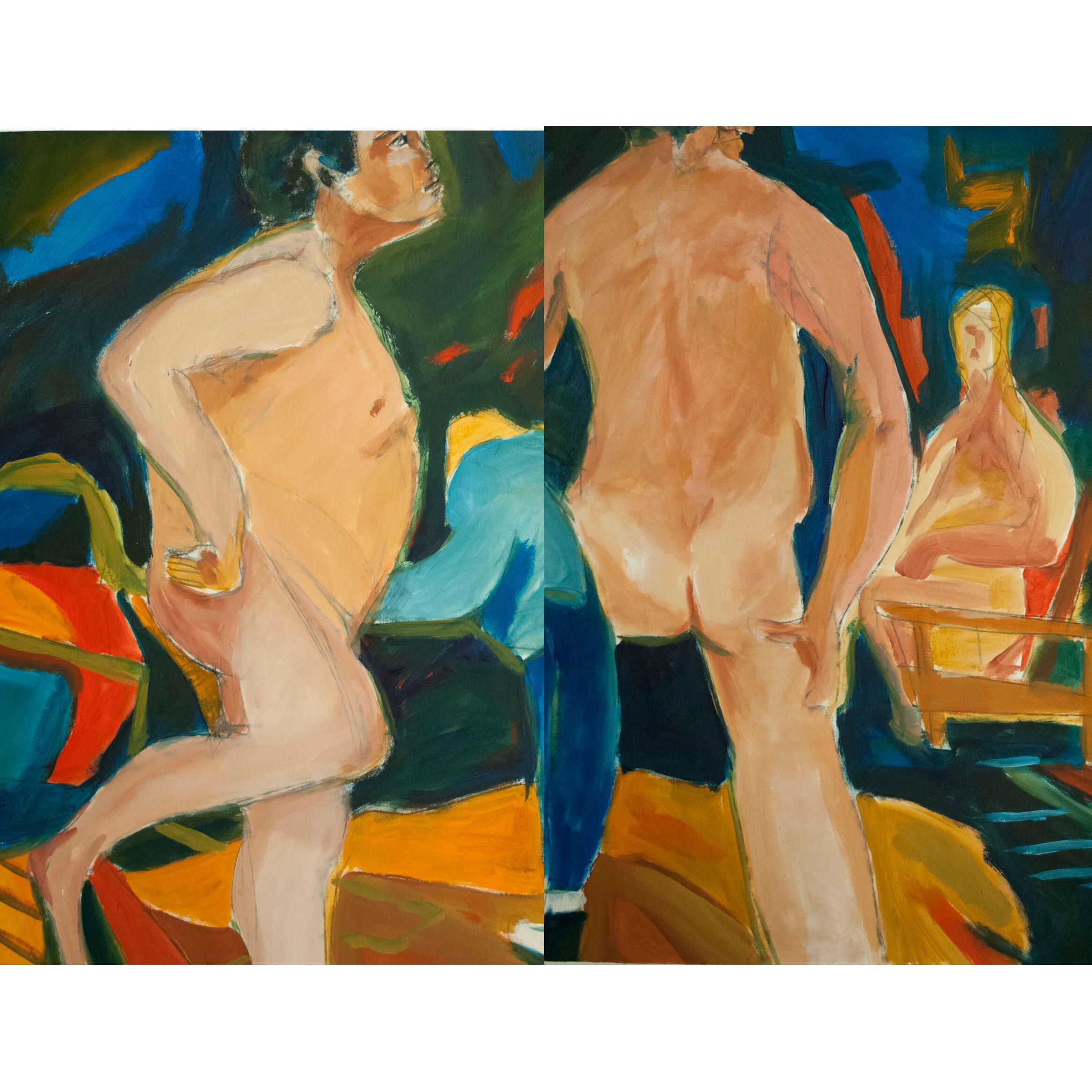 Diptych. Life painting, 4 models, one clothed. Image in good condition. Pinholes in corners, masking tape adhered to bottom border of .aArtwork Details