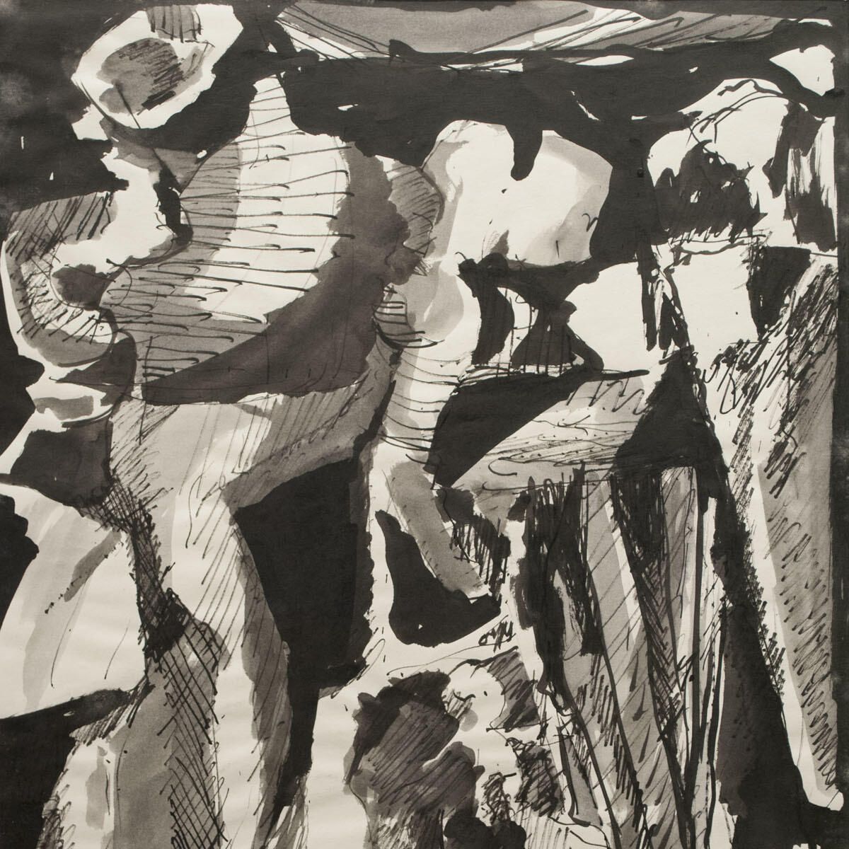 Poorly matted with masking tape. Pinholes in corners. Abstract composition.Location
