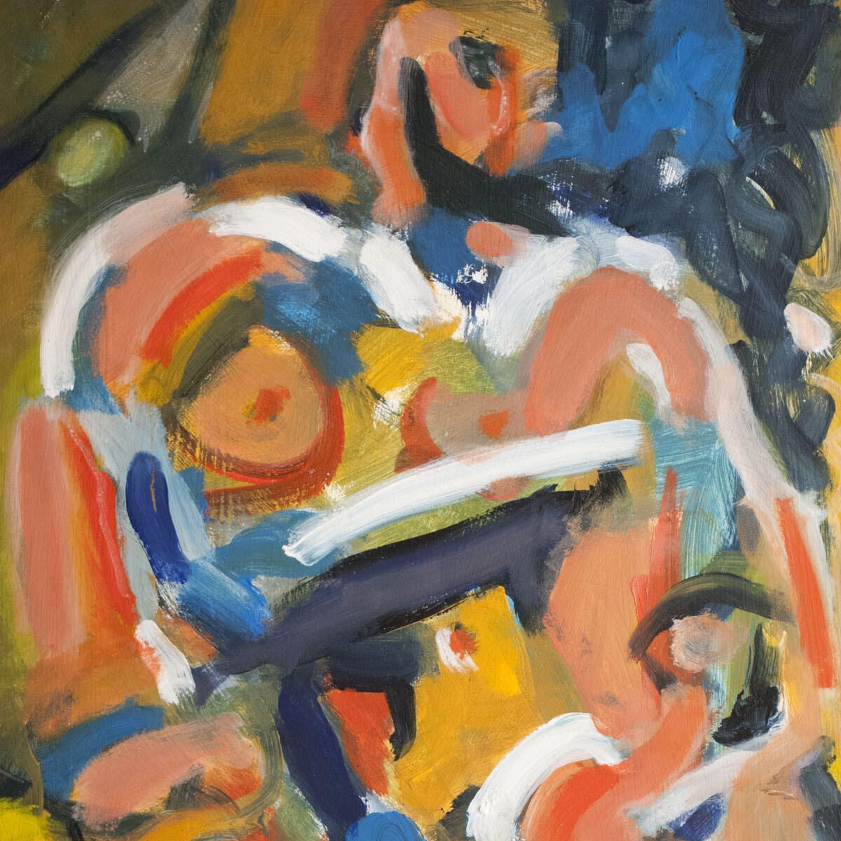 Bleed image, multiple pinholes and tears throughout edges. Tears repaired by artist with scrap paper and acrylic medium. Seated figure.Location