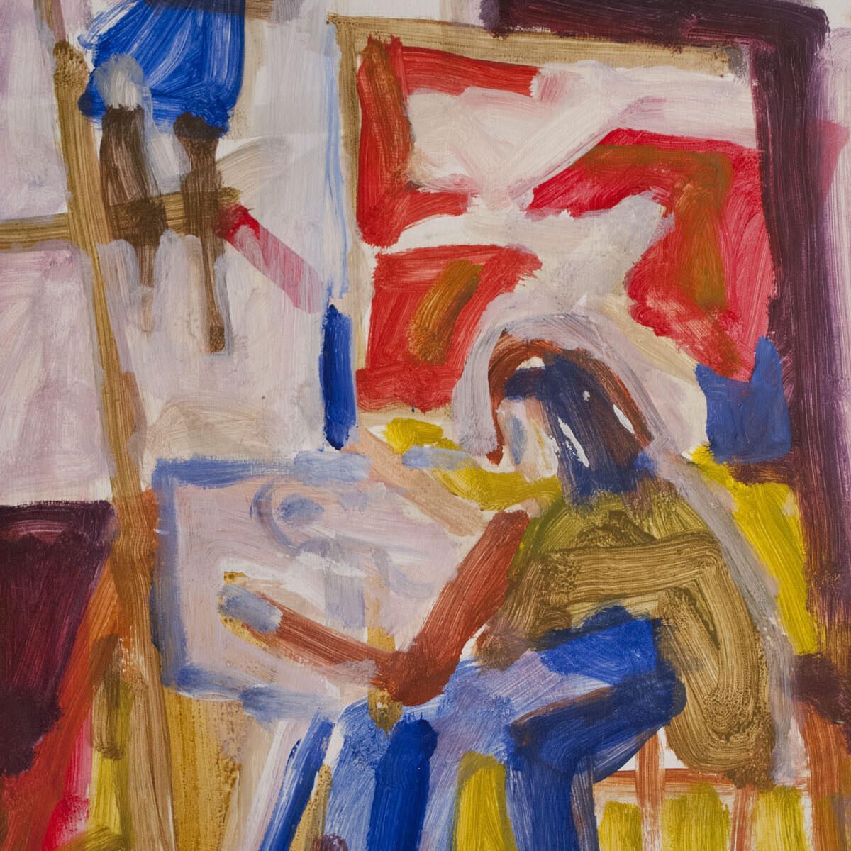 Bleed image, pinholes in each corner. In overall good condition. Interior studio scene.Location