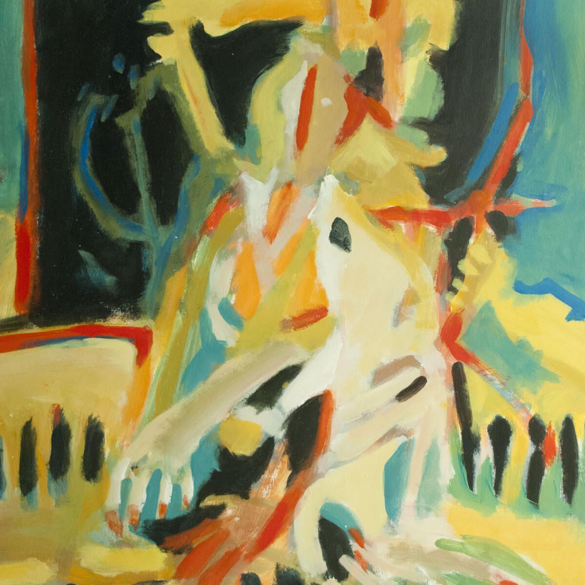 Multiple pinholes in corners, bleed image. Multiple points of white paint transferred. Abstract figure. Montserrat series.Location