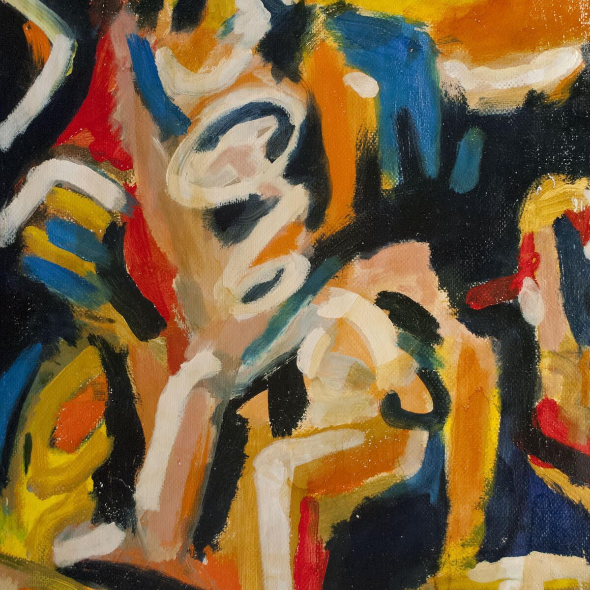 Bleed image, pinholes in each corner. Extensive paint transfer in image. Corners reinforced with canvas due to the extent of punctures. Figure?Location