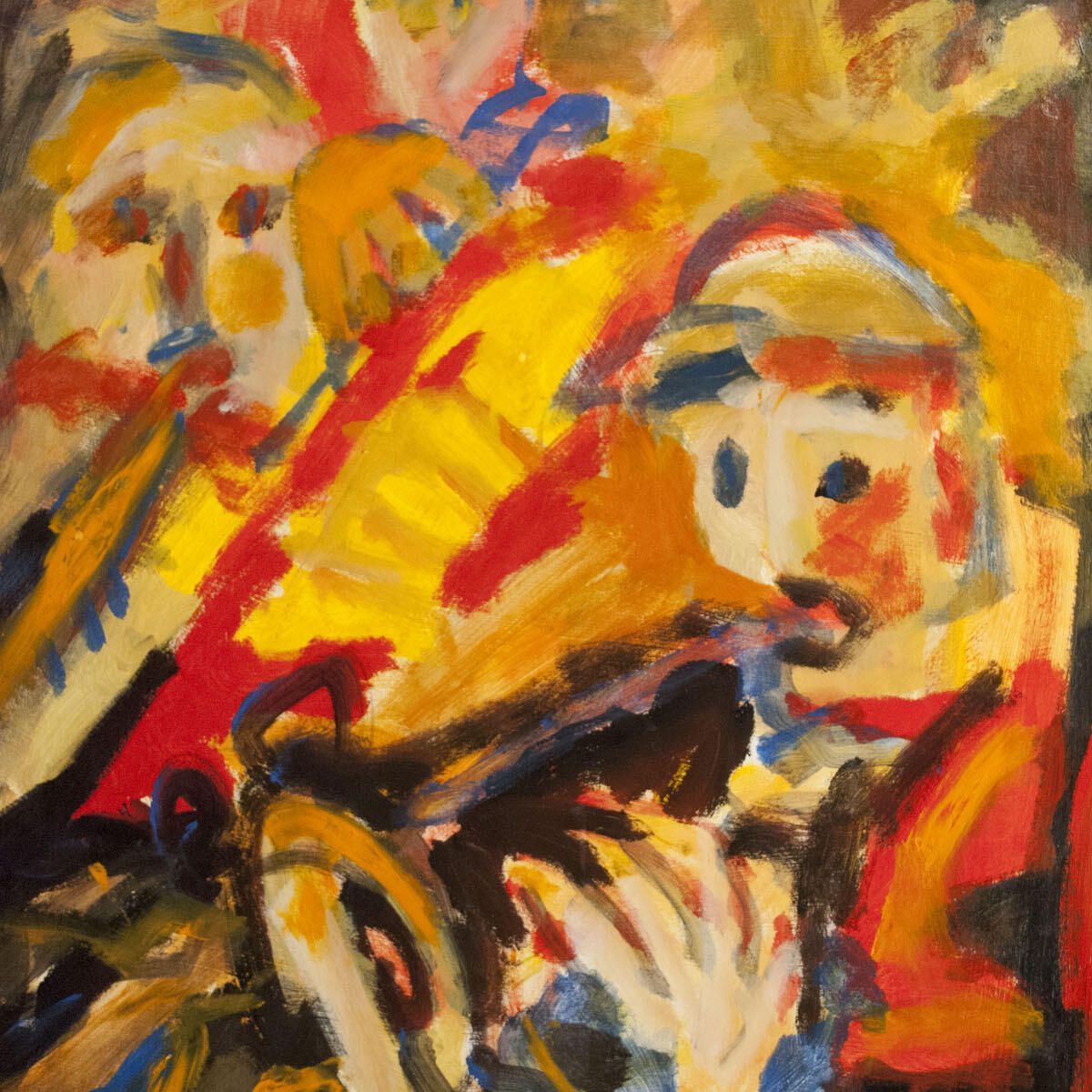 Pinholes in corners of images. Few points of paint transfer throughout image. Tear in image, repaired by artist with scrap paper and acrylic medium. Smudges in borders. Musicians playing. Montserrat Series.Location